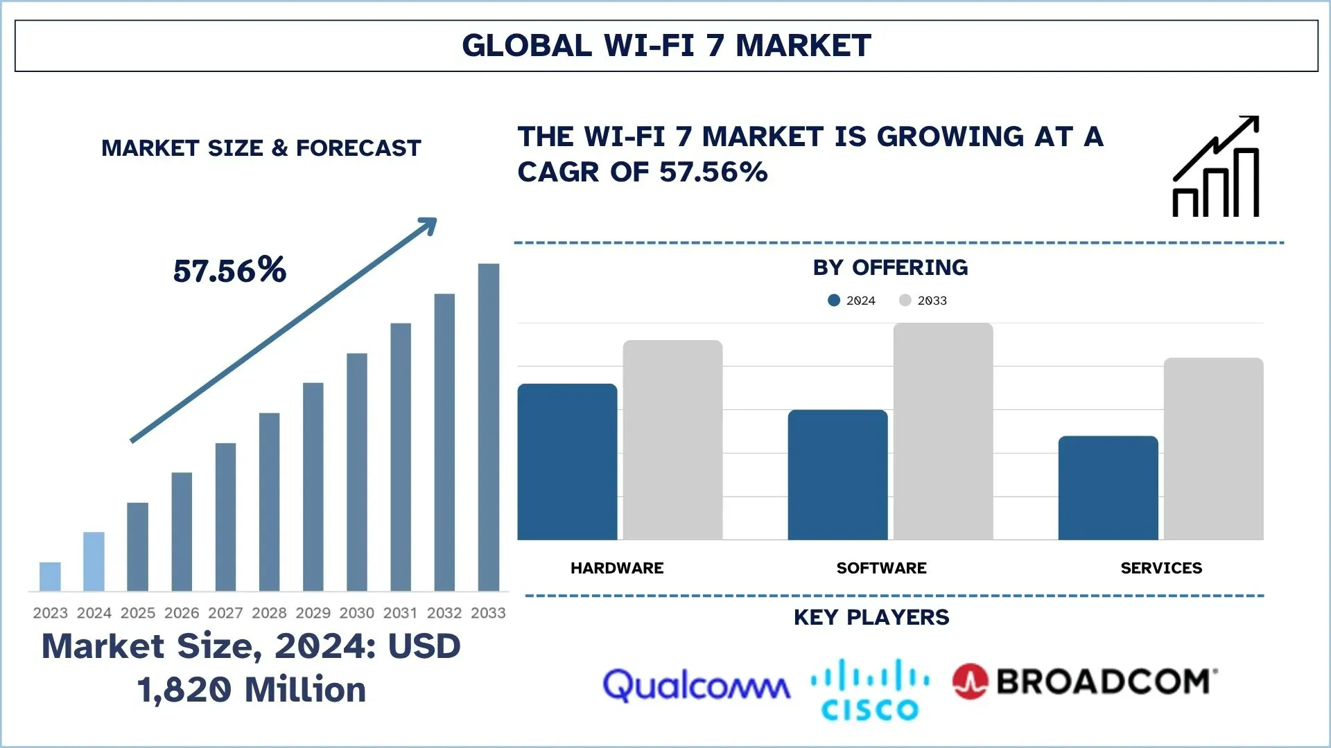According to UnivDatos analysis, technological advancements, growing research and development activities, and increasing demand for ultra-fast, low-latency connectivity are the major factors driving the global growth of the Wi-Fi 7 market. As per their “Wi-Fi 7 Market” report, the global market was valued at USD 1,820 million in 2024, growing at a CAGR of about 57.56% during the forecast period from 2025 - 2033 to reach USD million by 2033.