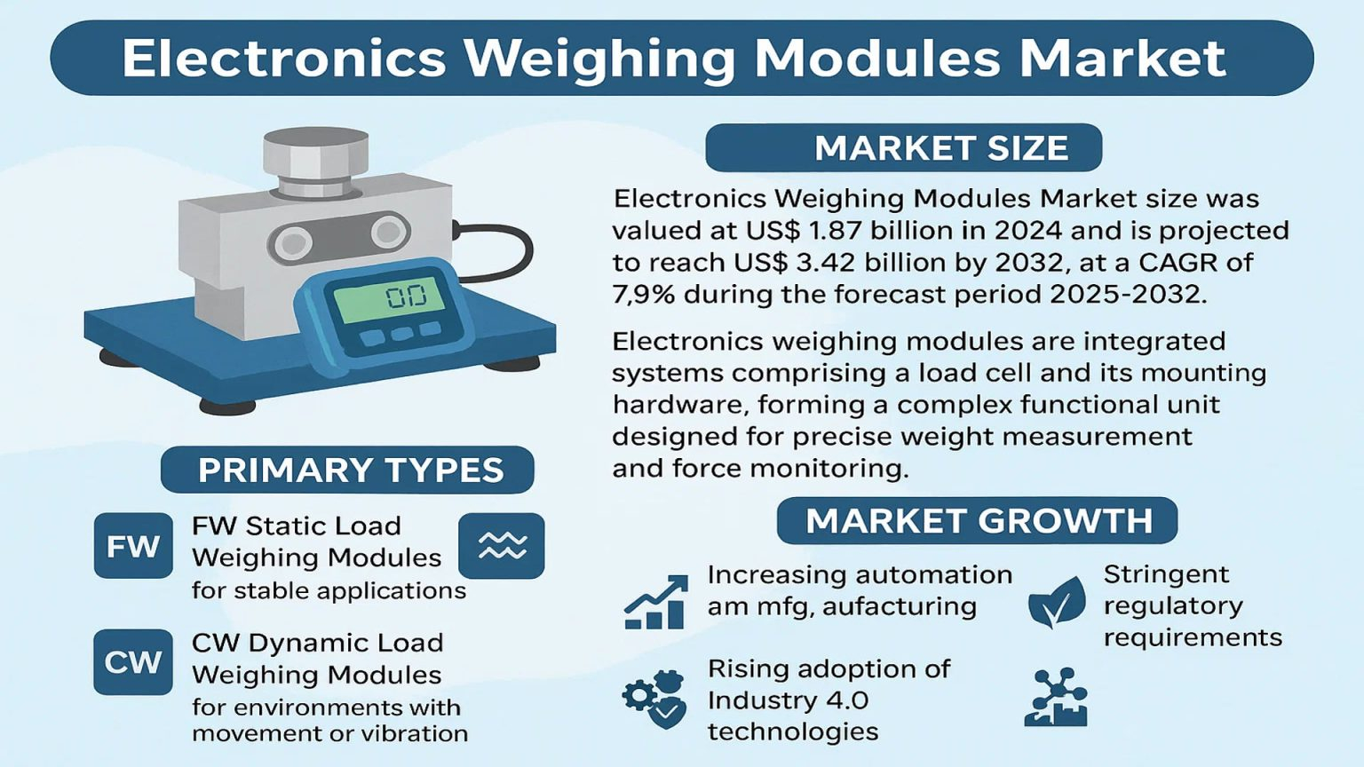 Electronics Weighing Modules Market, valued at a substantial USD 1.87 billion in 2024, is poised for robust expansion, projected to reach USD 3.42 billion by 2032. This growth, representing a compound annual growth rate (CAGR) of 7.9%, is detailed in a comprehensive new report published by Semiconductor Insight. The study underscores the indispensable role of these precision measurement systems in modern industrial automation, process control, and quality assurance across diverse sectors.