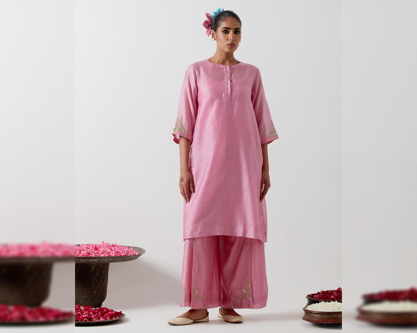 2. Footwear Matters: Embellished mojaris or classic heels can enhance the elegance of your kurta set.