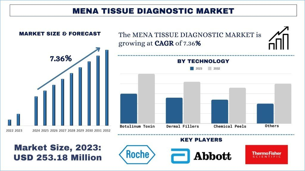 According to the UnivDatos, with the rising prevalence of cancer, investments in healthcare infrastructure, and the establishment of advanced diagnostic facilities, the MENA region has emerged as a medical tourism destination for advanced healthcare services will drive the scenario of the Tissue Diagnostic market, and as per their “MENA Tissue Diagnostic Market” report, the Market was valued at USD 253.18 million in 2023, growing at a CAGR of 7.36% during the forecast period from 2024 - 2032 to reach USD million by 2032.