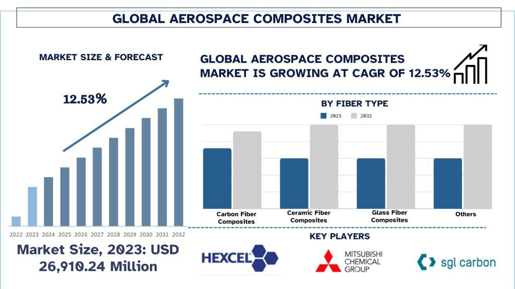 According to the Univdatos analysis, growing investments in the air mobility sector will surge in demand for the Global Aerospace Composites market, which will drive the global scenario of the “Global Aerospace Composites Market” report; the global market was valued at USD 26,910.24 million in 2023, growing at a CAGR of 12.53 % during the forecast period from 2024 - 2032 to reach USD million by 2032.
