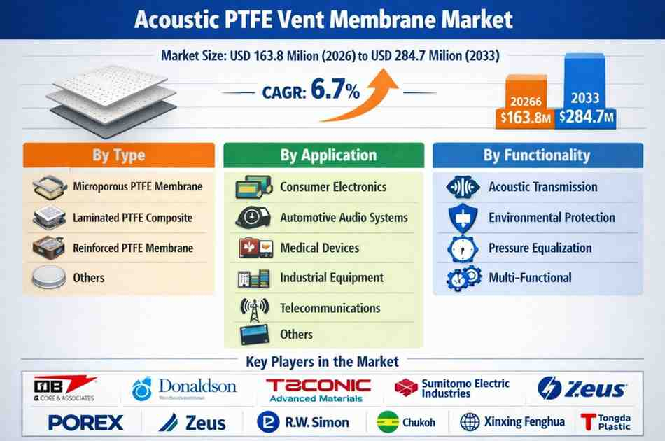Acoustic PTFE Vent Membrane Market Valued at USD 163.8 Million in 2026 Is Projected to Reach USD 284.7 Million by 2033 at a CAGR of 6.7%