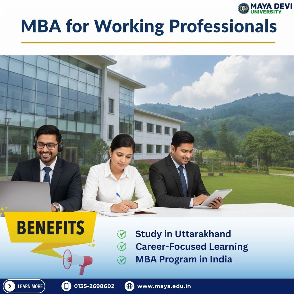 An MBA for working proffessional empowers individuals to enhance their skills, expand career opportunities, and prepare for leadership roles while continuing their employment. Institutions like Maya Devi University are committed to providing flexible, industry-oriented, and career-driven management education, supporting professionals in achieving sustainable and meaningful career growth.