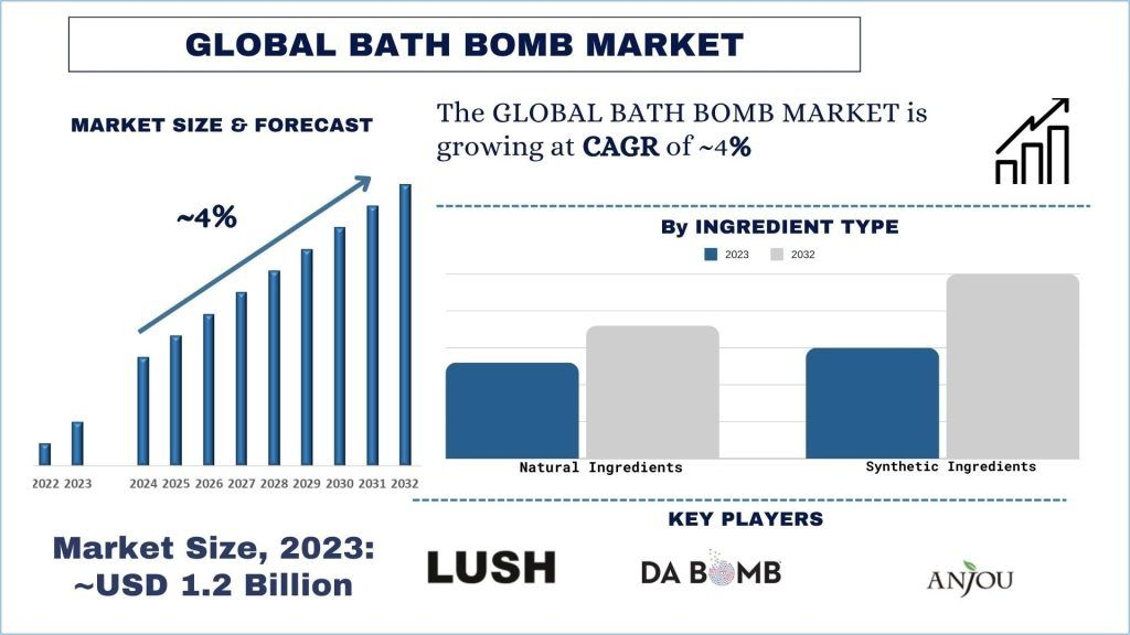 According to the Universal Data Solutions, the surge in product launches and the demand for personal care products will drive the global scenario of the bath bomb market. As per their “Bath Bomb Market” report, the global market was valued at ~USD 1.2 billion in 2023, growing at a CAGR of about 4% during the forecast period from 2024 - 2032 to reach USD billion by 2032.
