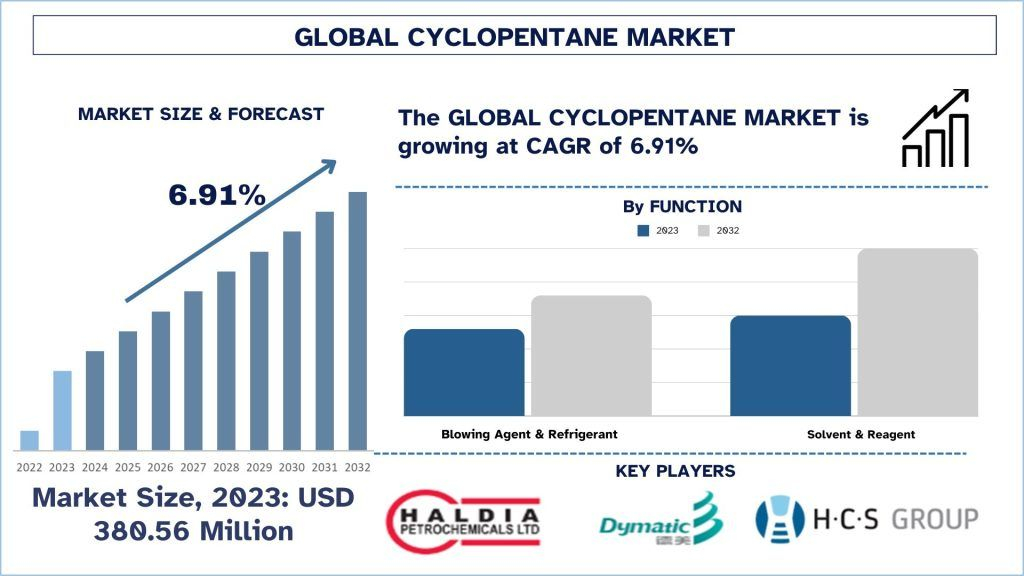 The Cyclopentane Market was valued at USD 380.56 million in 2023 and is expected to grow at a steady CAGR of around 6.91% during the forecast period (2024-2032),