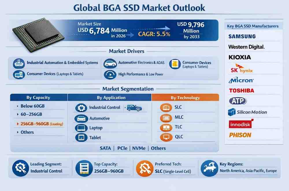 Global BGA SSD (Ball Grid Array Solid State Drive) market is witnessing steady expansion as demand accelerates for compact, high-performance, and reliable storage solutions across industrial, automotive, and consumer electronics applications. Valued at USD 6,784 million in 2026, the market is projected to reach USD 9,796 million by 2033, registering a CAGR of 5.5% during the forecast period.