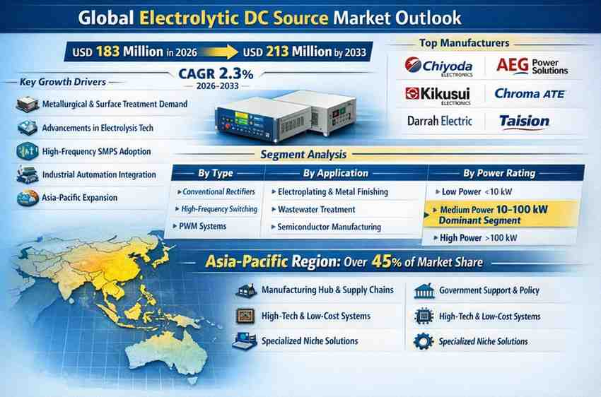 global Electrolytic DC Source market continues to expand steadily as metallurgical and electrochemical industries demand reliable and precise power conversion solutions. Valued at USD 183 million in 2026, the market is projected to reach USD 213 million by 2033, registering a CAGR of 2.3% during the forecast period.