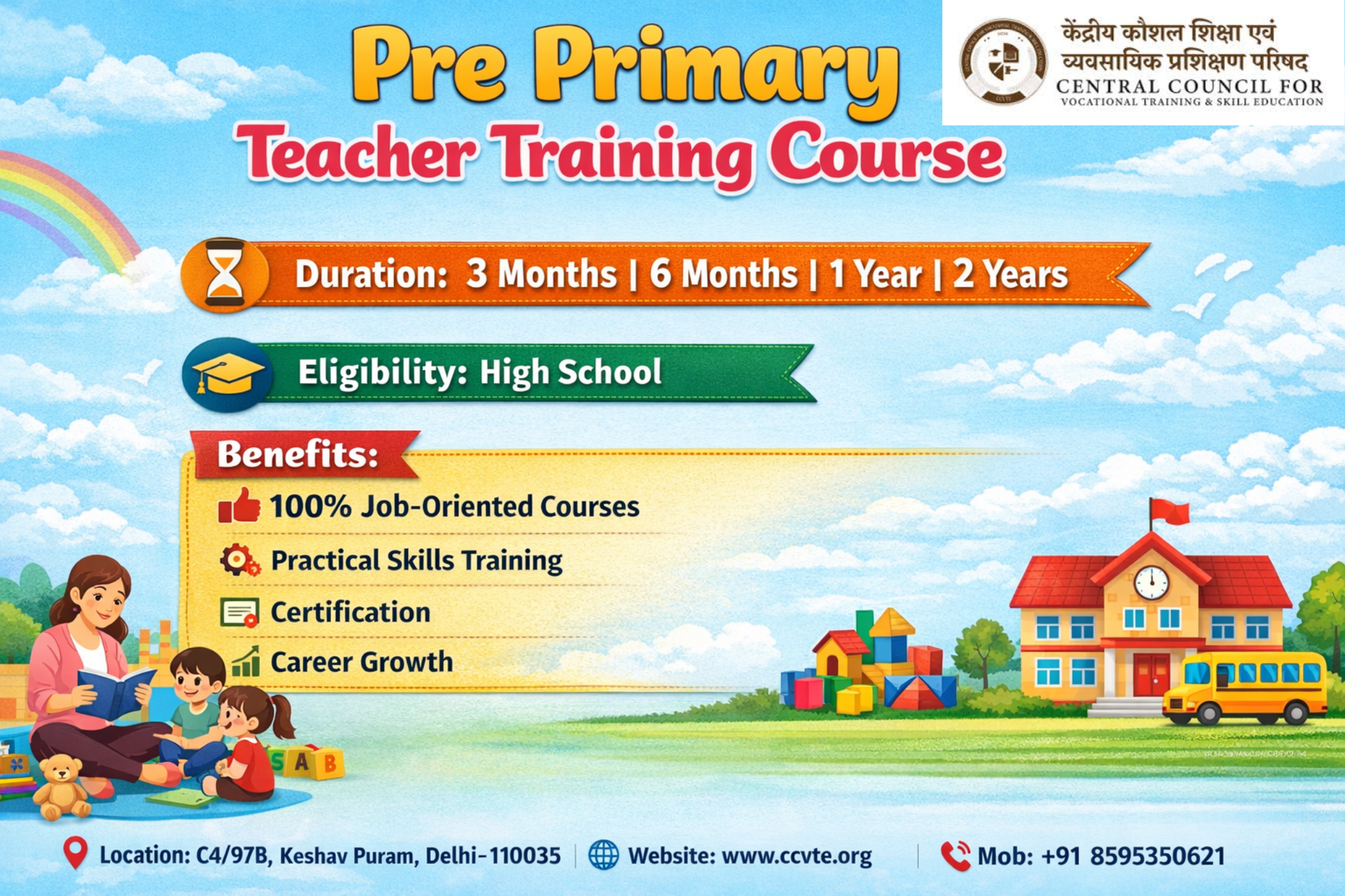 A career in pre-primary teaching is both fulfilling and impactful. A structured pre-primary teacher training course equips educators with essential skills, practical experience, and theoretical knowledge required to thrive in this profession. With multiple duration options ranging from 3 months, 6 months, 1 year, to 2 years and a simple eligibility criterion of high school completion, these courses are accessible to anyone with a passion for early childhood education. By focusing on holistic development, classroom management, creative teaching methods, and soft skills, pre-primary teacher training prepares teachers to deliver quality education, enhance their career prospects, and play a significant role in shaping the next generation. For those aspiring to build a successful teaching career, investing in a pre-primary teacher training course is a decisive step toward professional excellence and personal fulfillment.