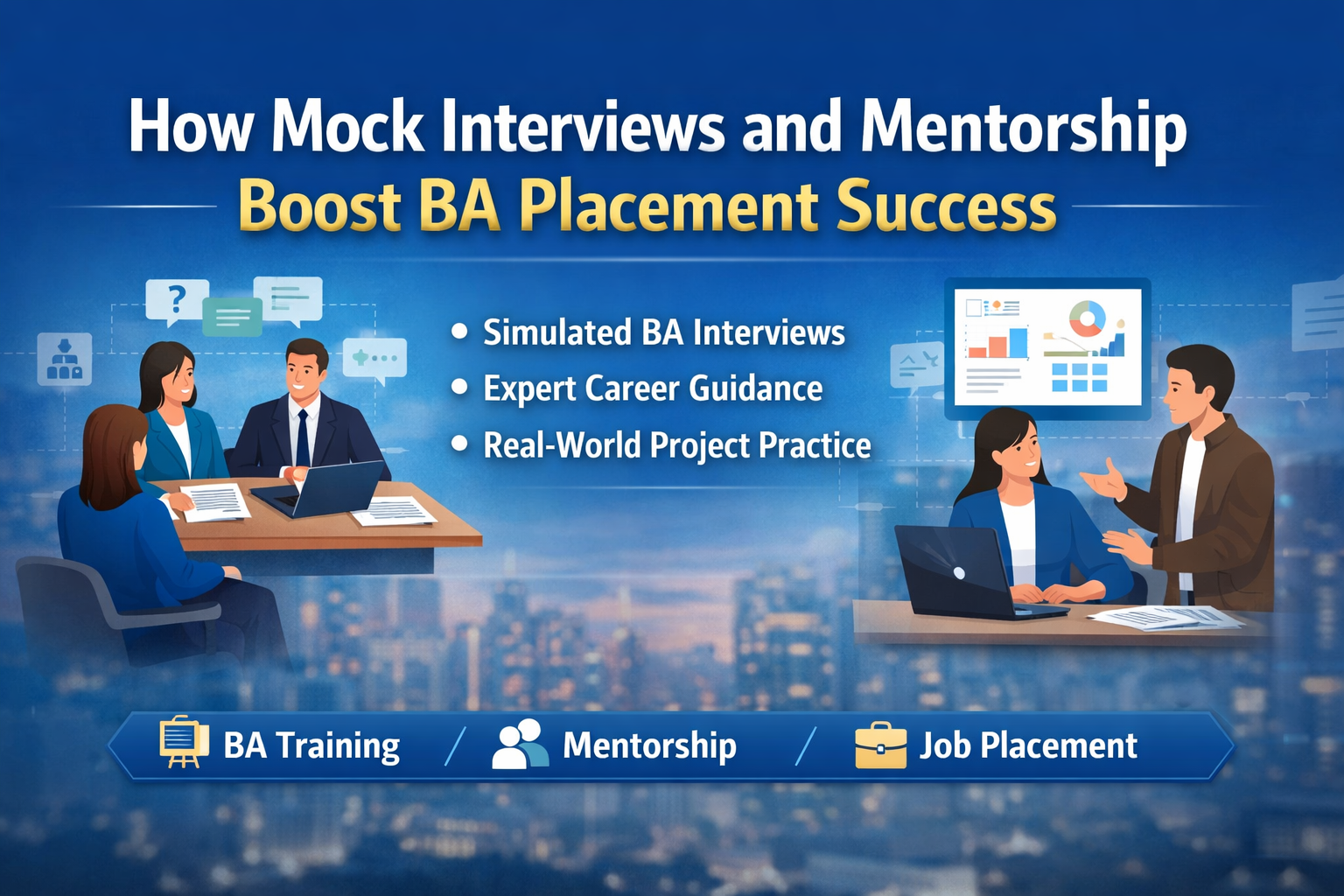 Mock interviews and structured mentorship improve Business Analyst (BA) placement success by aligning business analysis training with real enterprise hiring practices. These methods help learners translate theoretical BA certification knowledge into role-specific communication, documentation, and problem-solving skills that match how organizations evaluate candidates during technical, behavioral, and stakeholder-focused interviews.