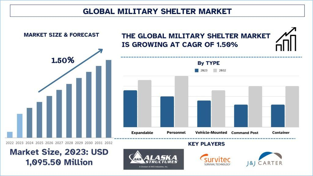 The Global Military Shelter Market was valued at USD 1,095.50 million in 2023 and is expected to grow at a strong CAGR of around 1.5% during the forecast period (2024-2032)