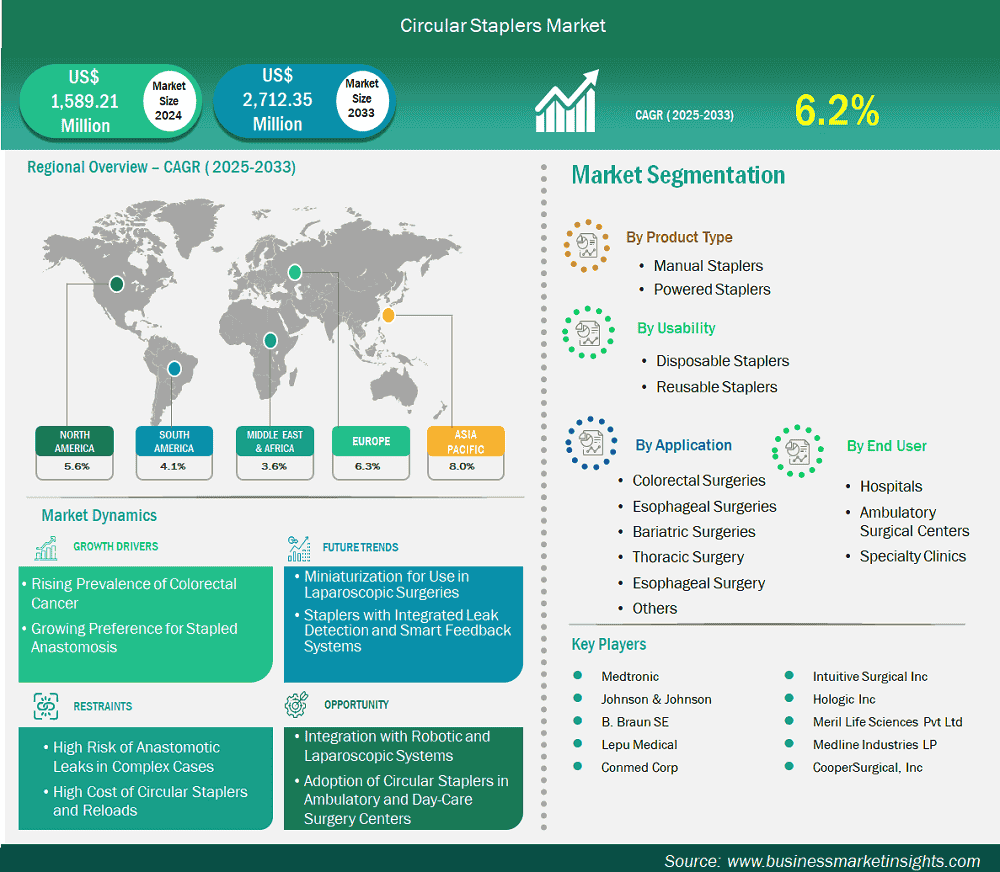 According to The Business Market Insights The Global Circular Staplers Market is experiencing significant momentum, driven by advancements in minimally invasive surgeries and rising demand for precise surgical tools. Valued at US$ 1,589.21 million in 2024, the market is forecasted to surge to US$ 2,712.35 million by 2033, achieving a steady CAGR of 6.2% from 2025 to 2033.
