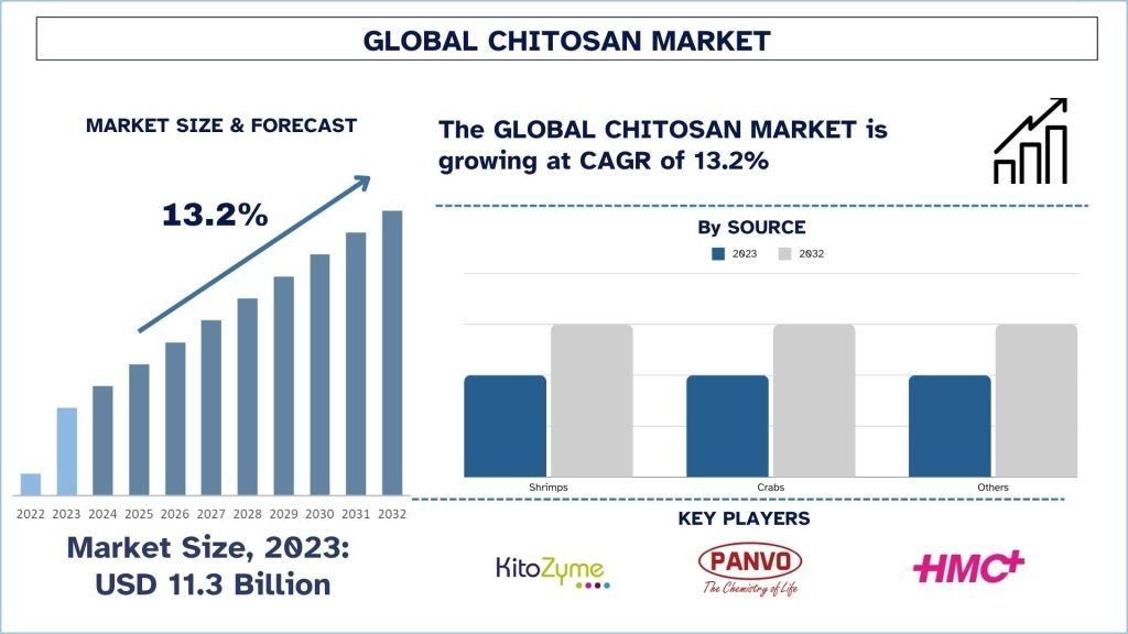 According to the UnivDatos analysis, comprehensive government support through environmental regulations, R&D grants, agricultural subsidies, waste management policies, and pharmaceutical regulations promoting sustainable and biodegradable materials will drive the global scenario of the Chitosan market. As per their “Chitosan Market” report, the global market was valued at USD 11.3 Billion in 2023, growing at a CAGR of 13.2% during the forecast period from 2024 - 2032 to reach USD Billion by 2032.