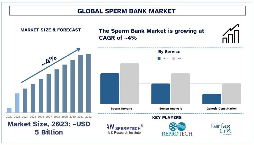 According to the UnivDatos analysis, The expansion of the sperm bank market into emerging markets presents significant growth opportunities. Furthermore, a growing number of single women opting for motherhood through sperm donation is driving market growth. The market was valued at USD ~5 billion in 2023, growing at a CAGR of ~4% during the forecast period from 2024 - 2032 to reach USD billion by 2032.