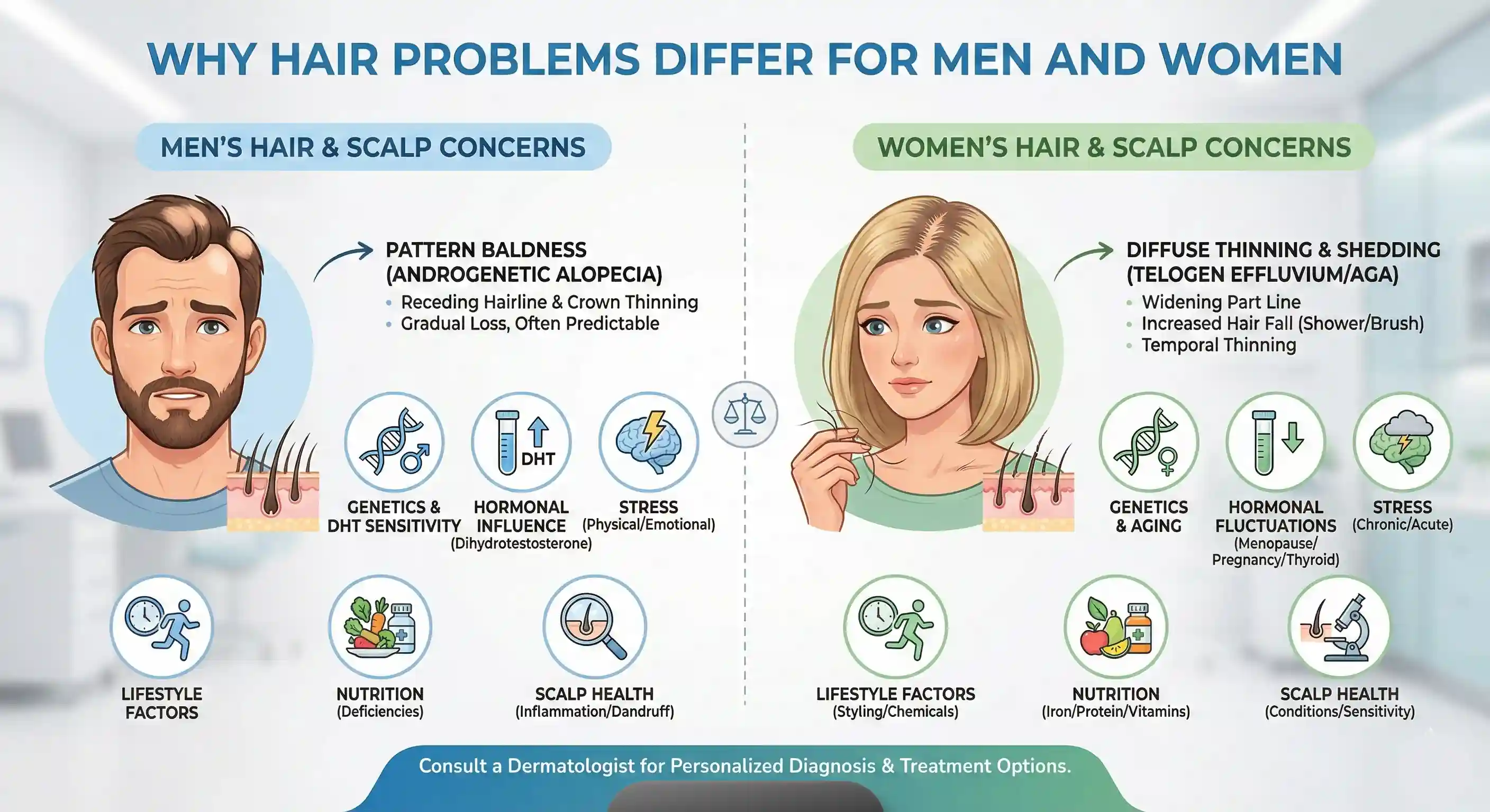 Hair problems differ for men and women due to distinct hormonal profiles, genetic influences, lifestyle patterns, and health factors. Men commonly experience pattern-based hair loss linked to DHT sensitivity, while women face diffuse thinning driven by hormonal changes, nutrition, and stress. Understanding these differences empowers individuals to take informed, proactive steps toward healthier hair and scalp care, regardless of gender.
