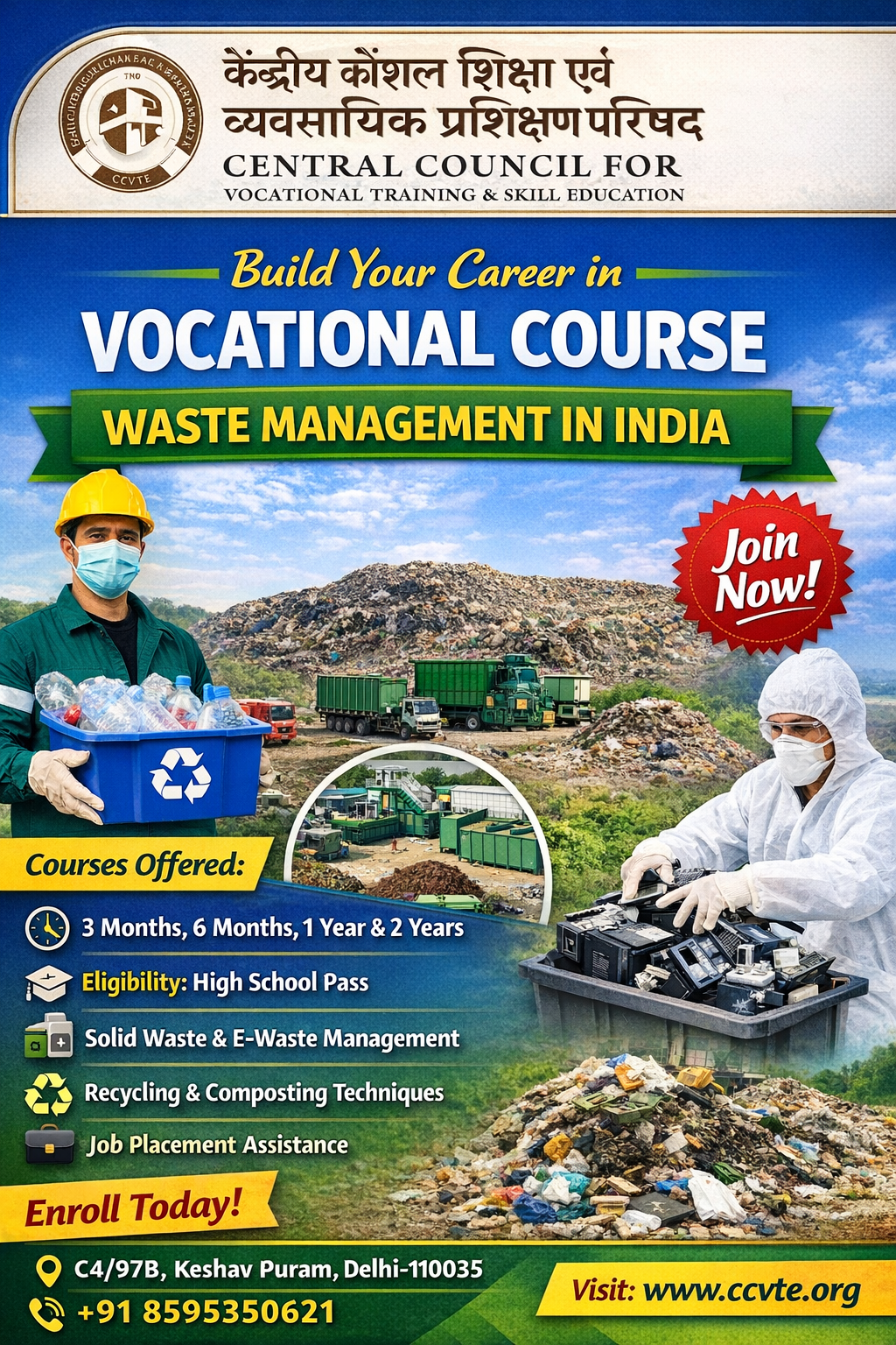 Vocational training in waste management is a skill-based education program that teaches students how to manage waste safely, efficiently, and in an environmentally responsible manner. The training emphasizes practical exposure, real-world applications, and industry-specific skills.