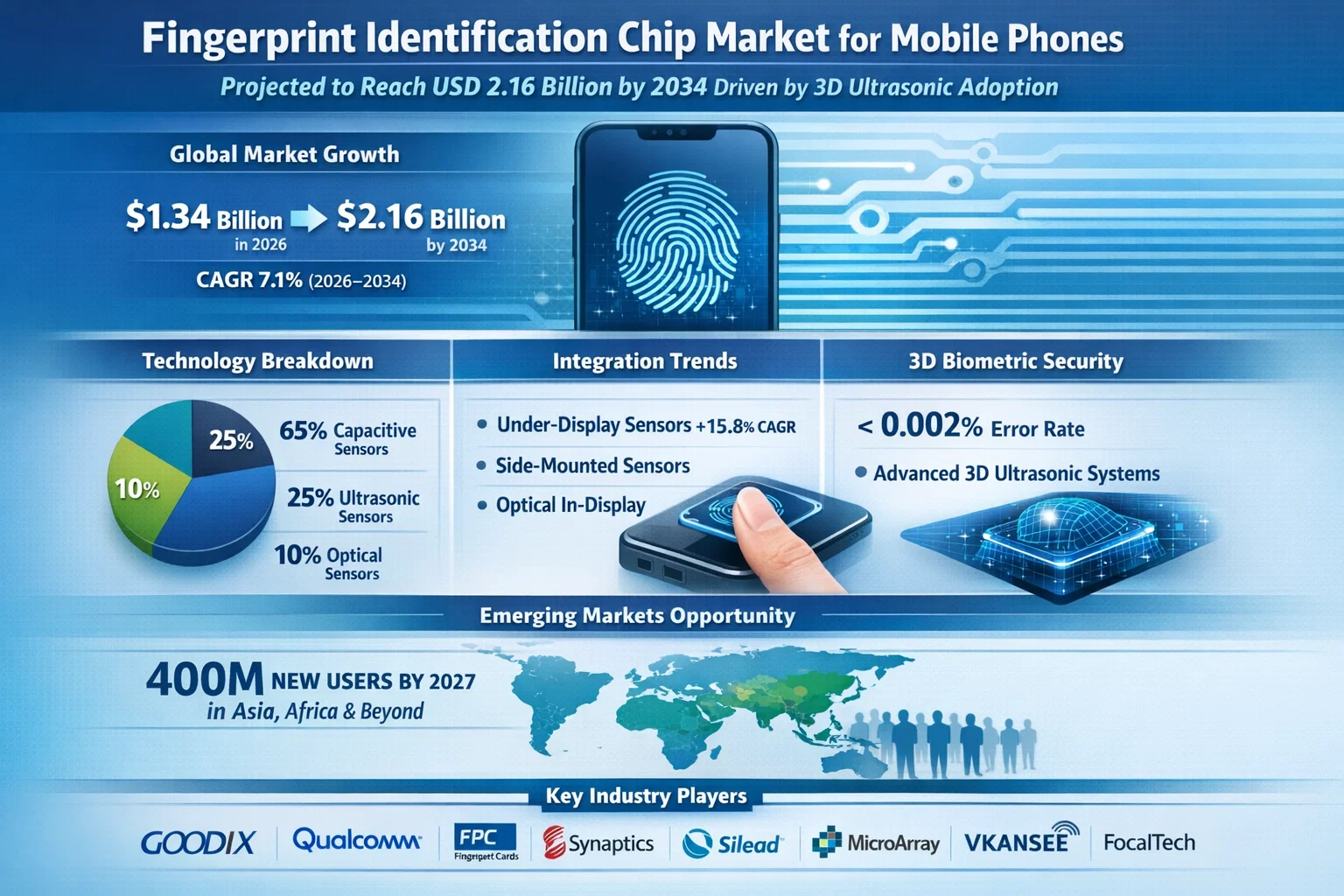 As of early 2026, the market is witnessing a technological pivot. While capacitive sensors maintain a 65% market share due to their cost-efficiency in budget devices, ultrasonic sensors are the fastest-growing segment. These chips, led by innovations from Qualcomm and Goodix, are increasingly preferred for their ability to function through wet or dirty fingers and their high resistance to 2D "spoofing" attempts.