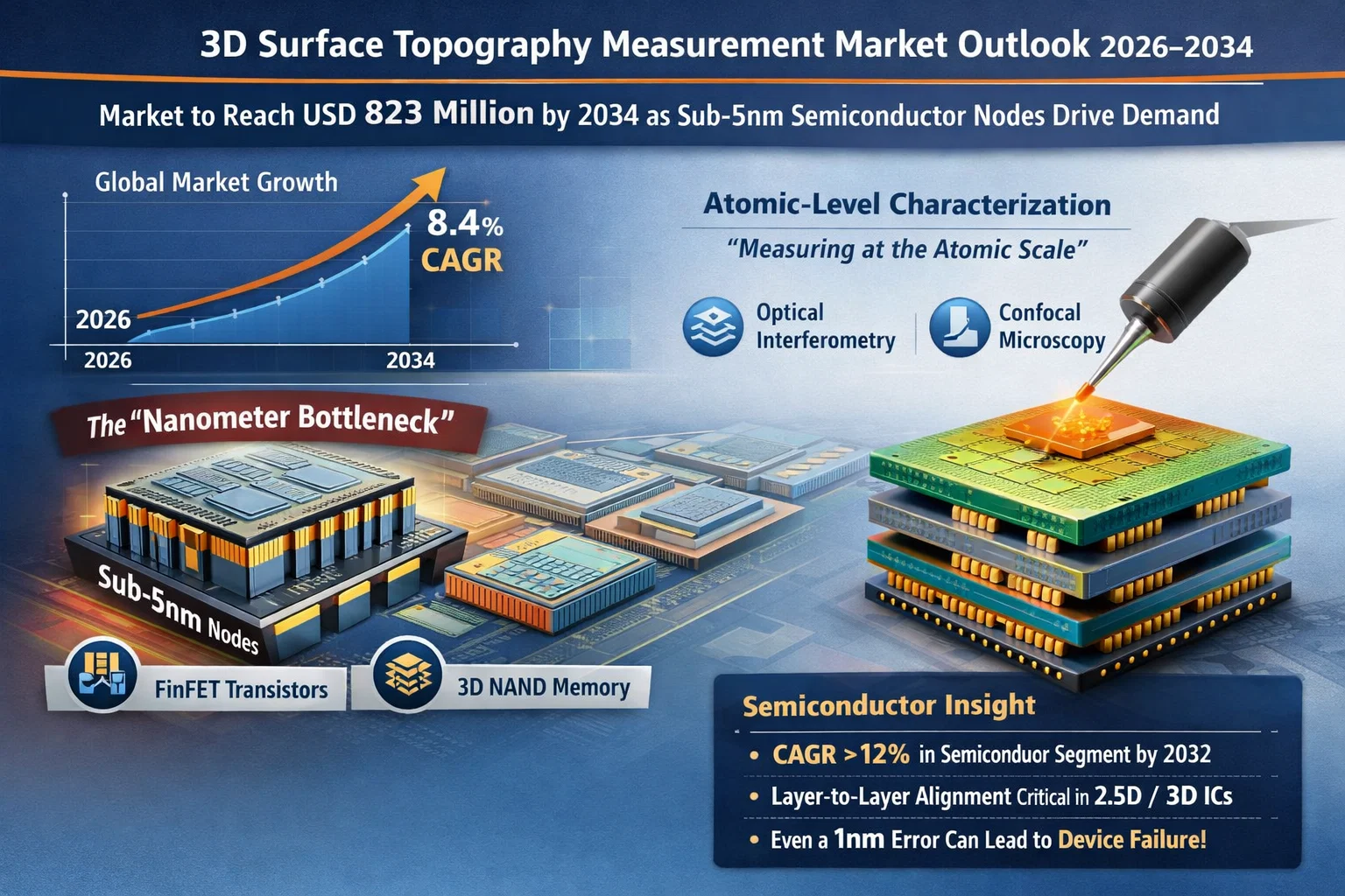 Global 3D Chips (3D IC) Market, valued at USD 14.73 billion in 2026, is projected to reach an exponential USD 43.87 billion by 2034. This growth, moving at a powerful compound annual growth rate (CAGR) of 14.62%, signals a paradigm shift in semiconductor manufacturing as the industry moves beyond traditional 2D architectures to overcome physical scaling limits.