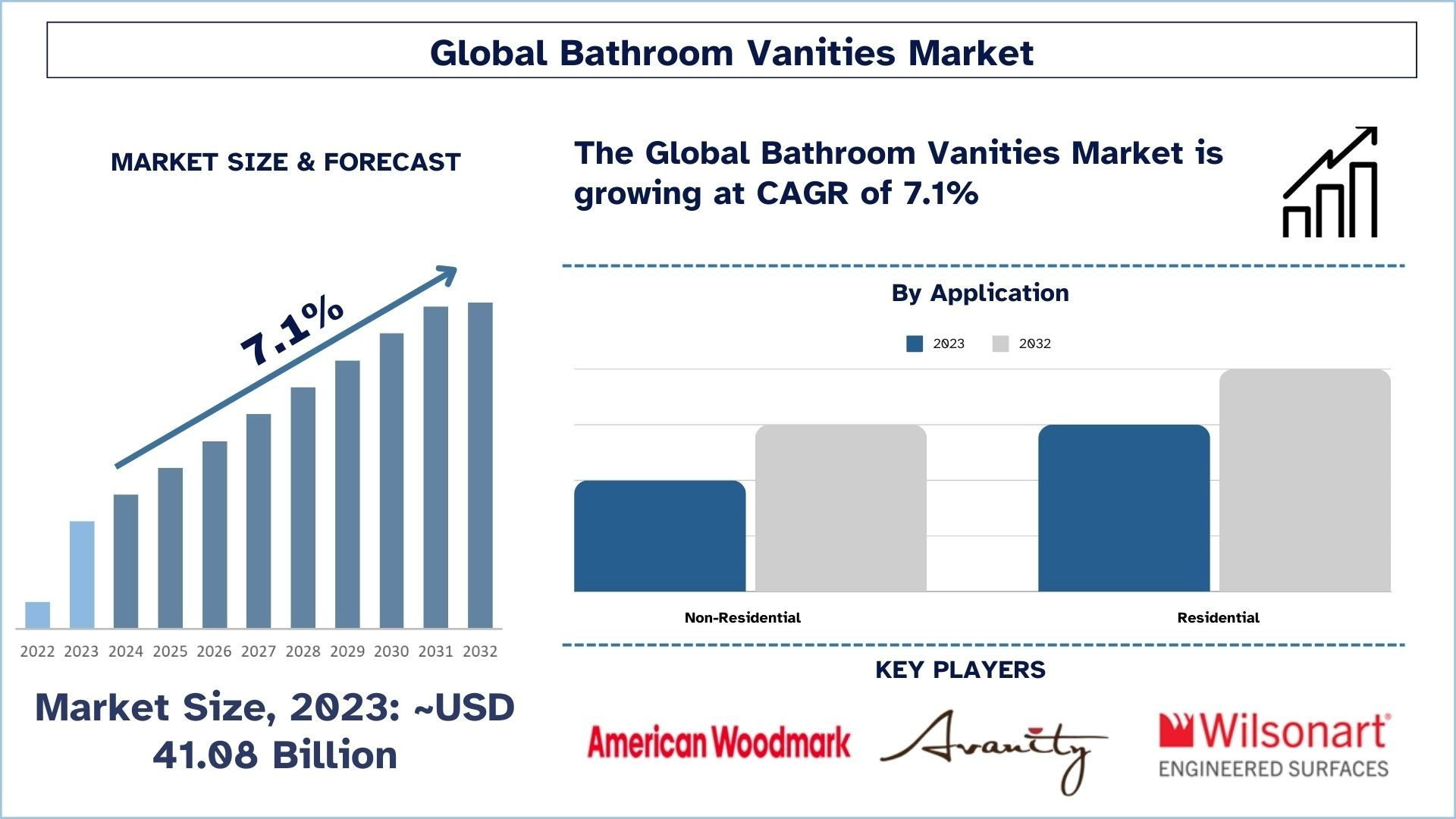 The Global Bathroom vanities Market was valued at USD 41.08 billion in 2023 and is expected to grow at a strong CAGR of around 7.1% during the forecast period (2024-2032)