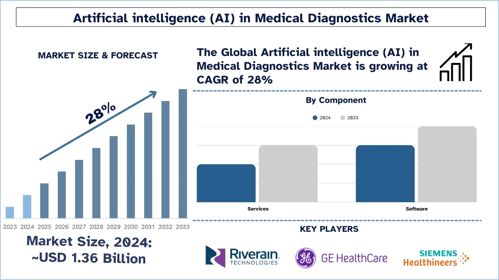 AI in the Medical Diagnostics Market was valued at approximately USD 1.36 billion in 2024 and is expected to grow at a substantial CAGR of around 28% during the forecast period (2025-2033),