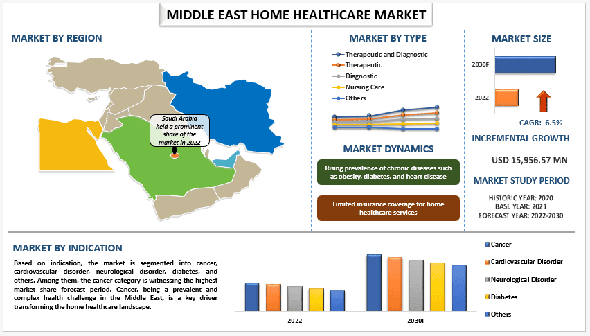 The Middle East Home Healthcare Market was valued at USD 15,956.57 million in the year 2022 and is expected to grow at a strong CAGR of around 6.5% during the forecast period 2023-2030.