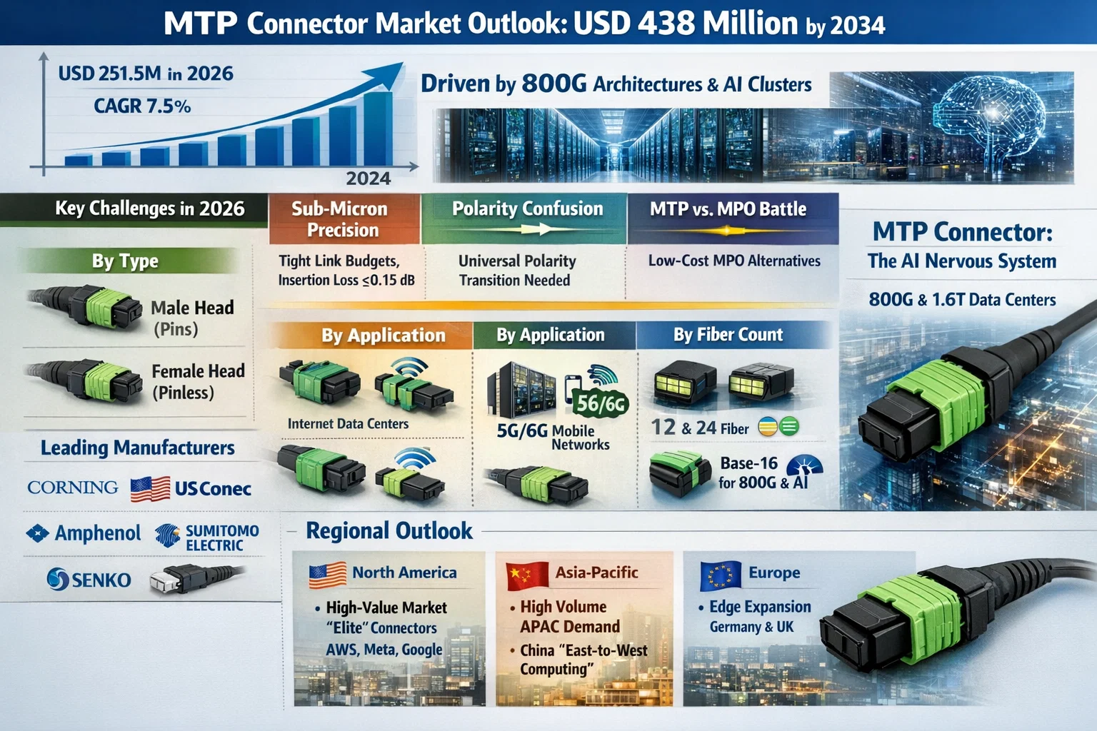 Global Multi-fiber Termination Push-on (MTP) Connector Market, valued at USD 251.5 million in 2026, is projected to reach USD 438.4 million by 2034, growing at a CAGR of 7.5%. As of early 2026, MTP connectors—the high-performance, precision-engineered evolution of the MPO standard—have become the "nervous system" of the AI-driven data center, facilitating the massive parallel optics required for 400G and 800G Ethernet.