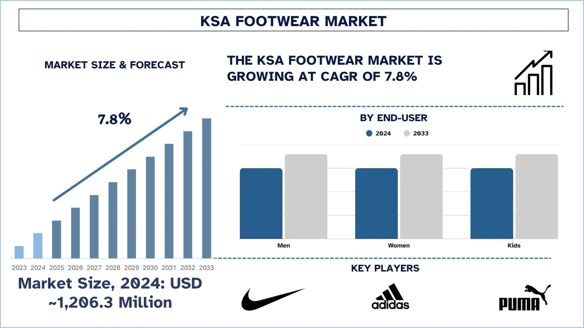 The KSA Footwear Market was valued at USD 1,206.3 million in 2024 and is expected to grow to a strong CAGR of around 7.8% during the forecast period Market Size & Growth: The total value of the Saudi footwear market is forecast to increase to over USD 2.5 billion this year (2024) and will expand at 5.5% a year until 2030, chiefly due to higher income and shifting fashion trends.