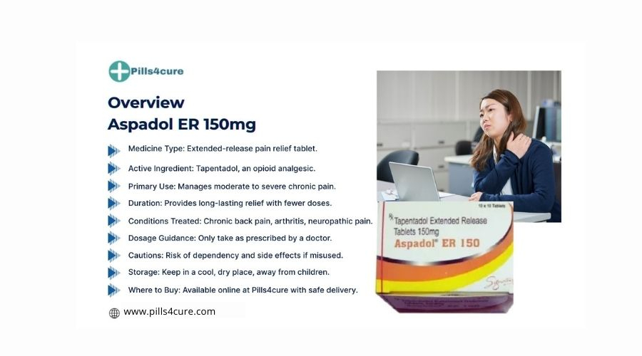 Medicine name Aspadol ER 150mg contains the main Vital component Tapentadol, a centrally acting analgesic. The “ER” stands for extended-release, meaning the drug is designed to release gradually into the bloodstream, providing relief for up to 12 hours. Unlike short-acting painkillers that require frequent dosing, Aspadol ER tablet ensures continuous comfort. Its dual mechanism blocking pain signals and modulating norepinephrine sets it apart from many single-action drugs.