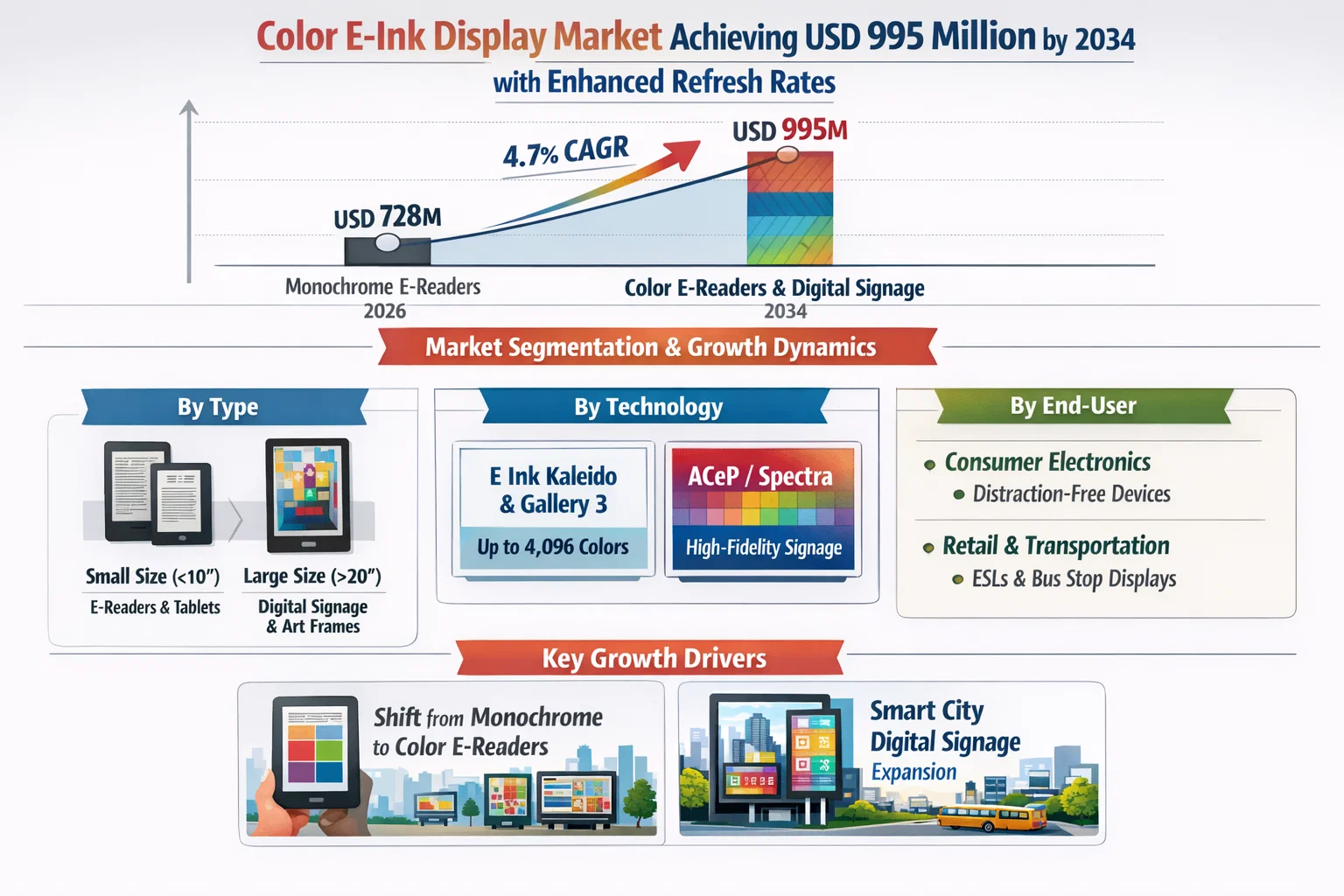 Global Color E-ink Display market, valued at USD 728 million in 2026, is projected to reach USD 995 million by 2034. This growth represents a steady 4.7% CAGR, driven by the transition of e-readers from monochrome to color and the rapid expansion of energy-efficient digital signage in smart cities. As of 2026, the technology has reached a tipping point where improved refresh rates and color fidelity are moving E-ink from static pages to interactive "paper-like" tablets.