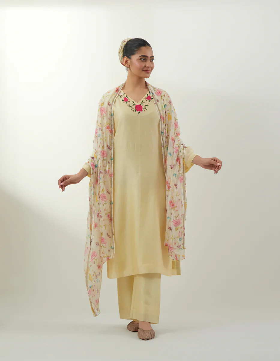 A narrower upper body with wider hips calls for kurta sets that soften proportions.