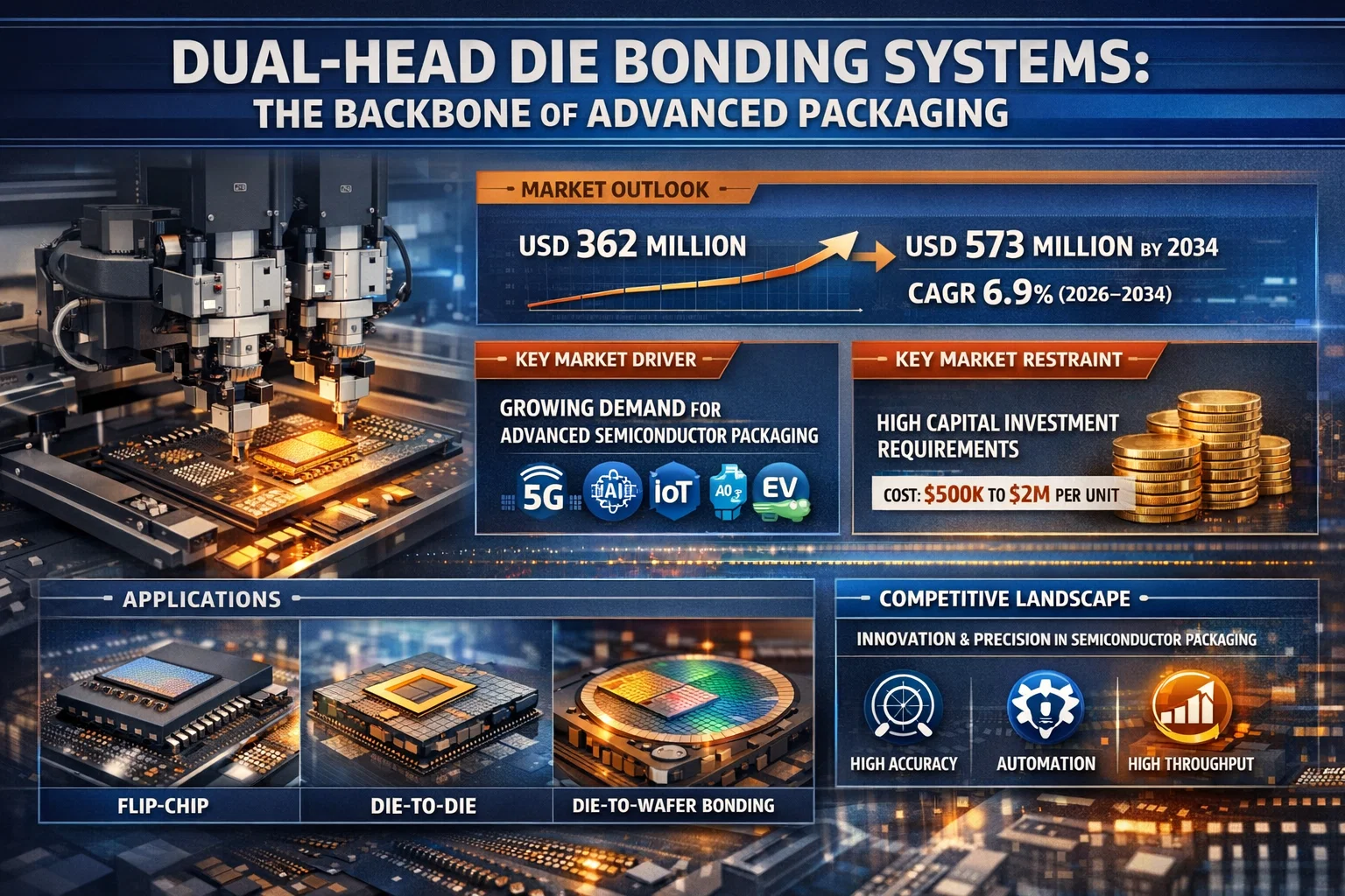 Global Dual Head Semiconductor Die Bonding System market is rapidly gaining strategic importance as semiconductor manufacturers race to scale advanced packaging capabilities. Valued at USD 362 million in 2026, the market is projected to reach USD 573 million by 2034, expanding at a CAGR of 6.9 percent during the forecast period 2026–2034.