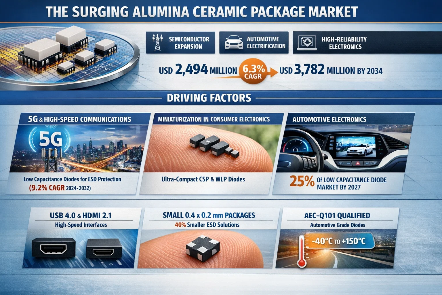 The semiconductor industry—valued at USD 579 billion in 2022 and projected to reach USD 790 billion by 2029—is reshaping packaging requirements. Strong growth in analog (20.76%) and logic (14.46%) semiconductors, combined with the rapid expansion of IoT, 5G infrastructure, and EV power electronics, is accelerating the shift toward advanced ceramic packaging solutions.