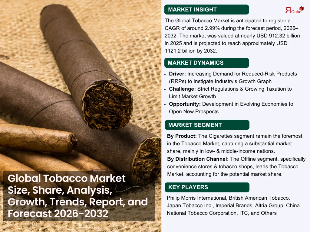According to The Report Cube latest research study, The Global Tobacco Market is anticipated to register a CAGR of around 2.99% during the forecast period, 2026–2032. The market was valued at nearly USD 912.32 billion in 2025 and is projected to reach approximately USD 1121.2 billion by 2032.