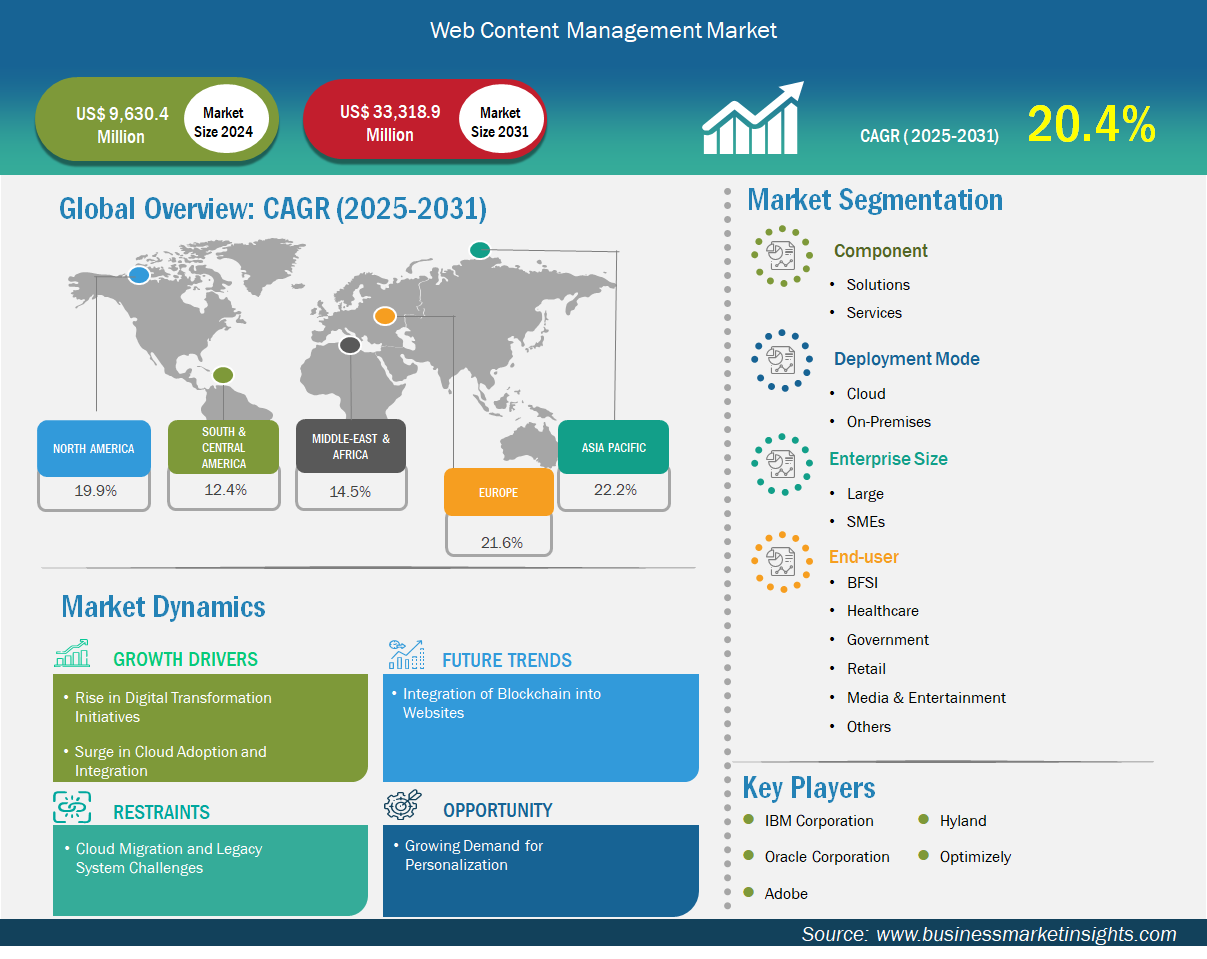 According to the Business Market Insights The Global Web Content Management (WCM) Market is on a trajectory for explosive growth, projected to surge from US$ 9,630.4 million in 2024 to US$ 33,318.9 million by 2031, achieving a robust compound annual growth rate (CAGR) of 20.4% from 2025 to 2031. This remarkable expansion, representing an 85% increase over the forecast period, is fueled by accelerating digital transformation initiatives worldwide, where businesses increasingly rely on advanced WCM systems to deliver seamless, personalized digital experiences across multiple channels.