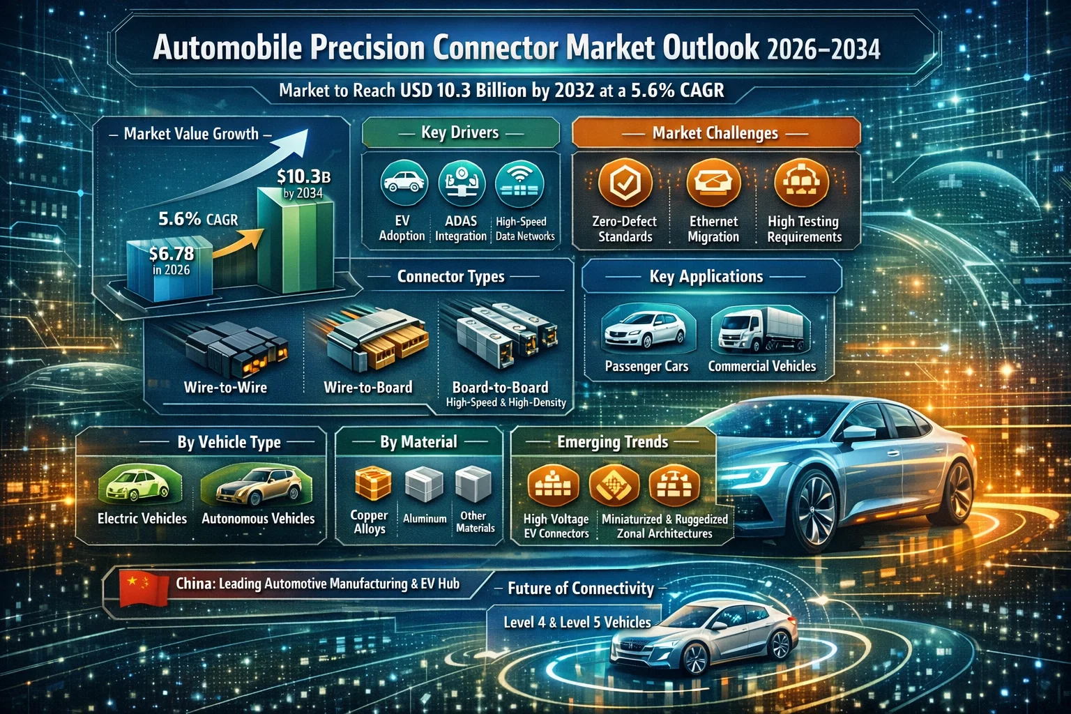 global Automobile Precision Connector Market size was valued at USD 6.78 billion in 2026 and is projected to reach USD 10.3 billion by 2034, at a CAGR of 5.6% during the forecast period 2026–2034. Growth is being fueled by accelerating vehicle electrification, rising ADAS integration, and the shift toward high-speed in-vehicle data networks across passenger and commercial platforms.