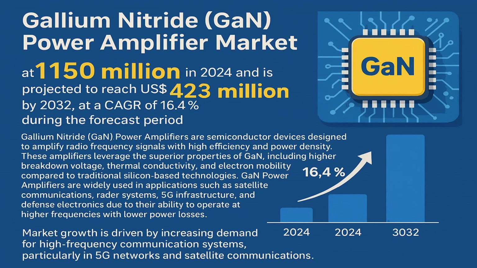 Gallium Nitride (GaN) Power Amplifier Market to Reach USD 423 Million Growing at a CAGR of 16.4%
