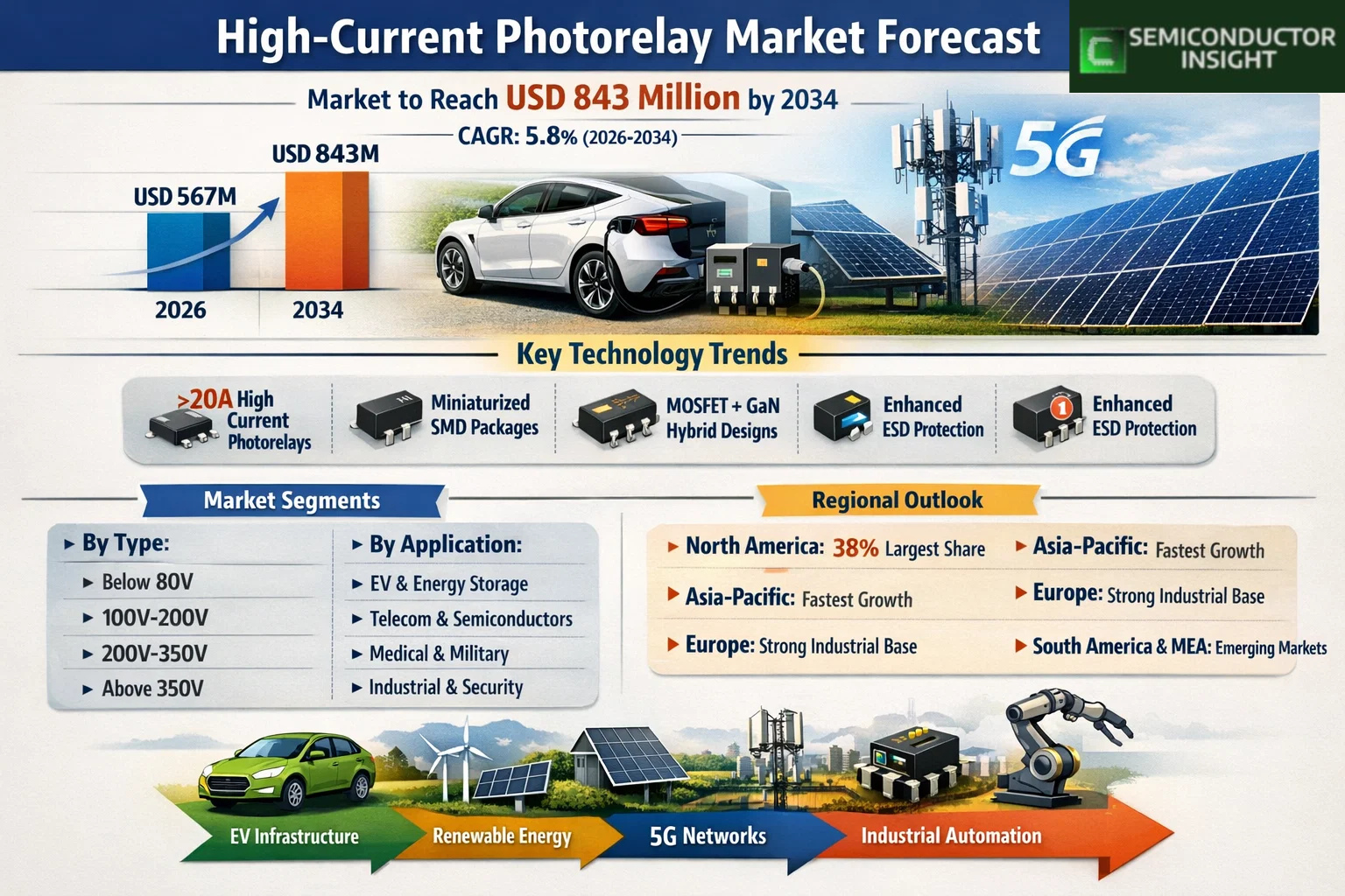 Global High-Current Photorelay Market was valued at USD 567 million in 2026 and is projected to reach USD 843 million by 2034, growing at a CAGR of 5.8% during the forecast period. Rising demand for solid-state, high-reliability switching solutions across electric vehicles, renewable energy systems, telecom networks, and industrial automation is accelerating market growth worldwide.