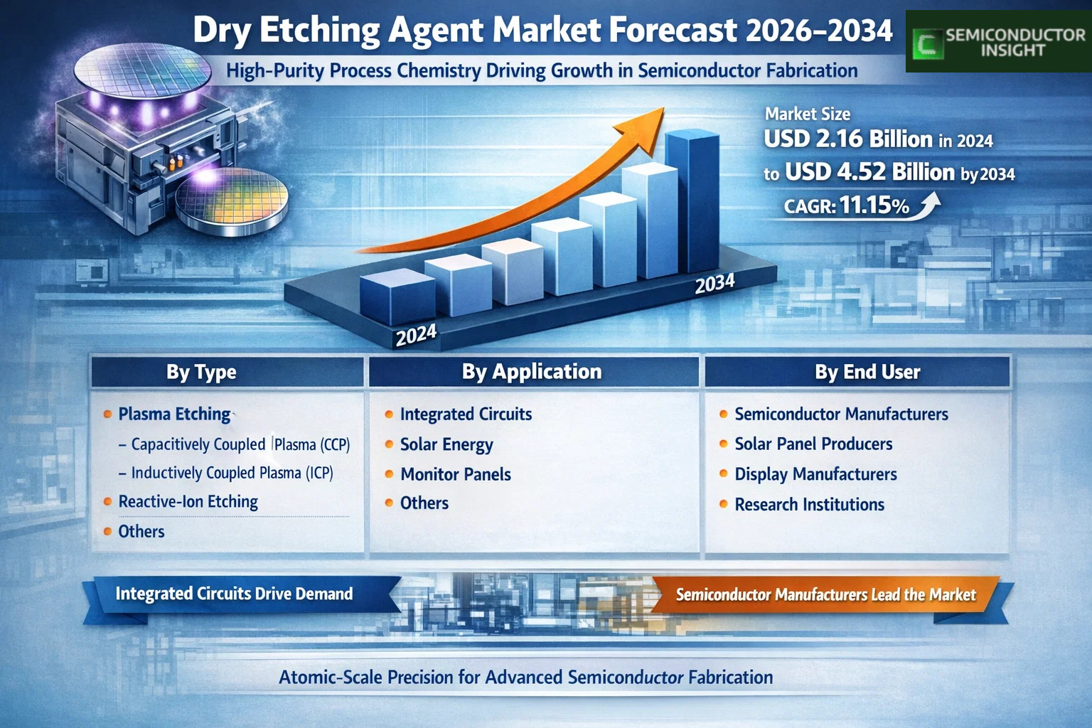 Global Dry Etching Agent Market was valued at USD 2.16 billion in 2026 and is projected to reach USD 4.52 billion by 2034, growing at a CAGR of 11.15% during the forecast period 2026–2034. Market expansion is closely linked to advanced semiconductor fabrication, where dry plasma-based etching has become essential for nanoscale pattern transfer and complex 3D device architectures.
