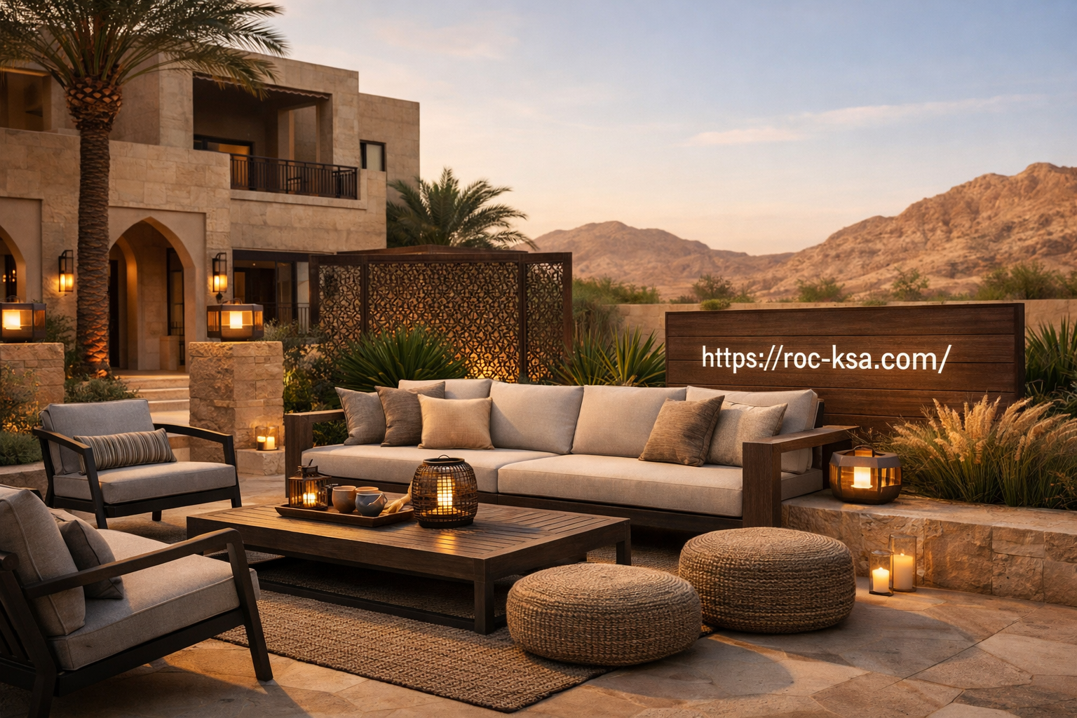 In luxury villas, modern outdoor seating Saudi Arabia often mirrors indoor living rooms, just with tougher materials.