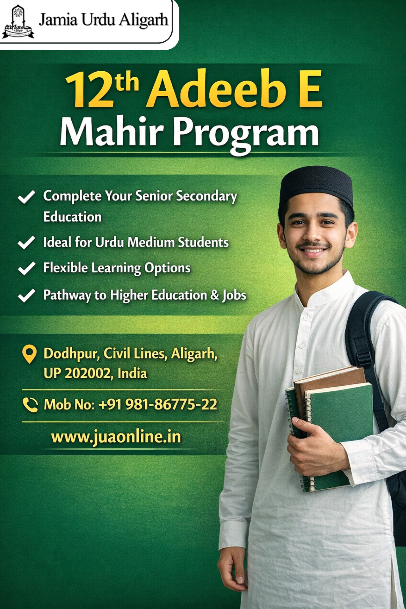 The 12th Adeeb E Mahir Program is a Senior Secondary level qualification designed especially for students who want to complete their 12th equivalent education through an Urdu medium background. This program is widely known as the Adeeb-e-Mahir Secondary Program and is considered equivalent to the Senior Secondary (Class 12th) level in many cases.