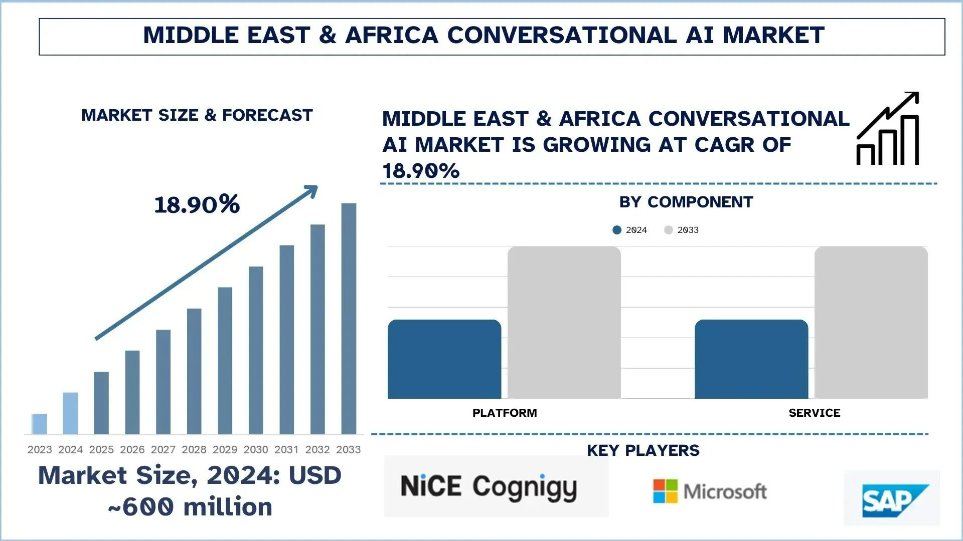 According to UnivDatos, government-led digital service delivery & national AI programs, and Contact-center modernization with a shift to CCaaS are some of the key factors driving the market growth. As per their “Middle East & Africa Conversational AI Market” report, the Middle East & Africa market was valued at USD 600 million in 2024, growing at a CAGR of about 18.9% during the forecast period from 2025 - 2033 to reach USD million by 2033.