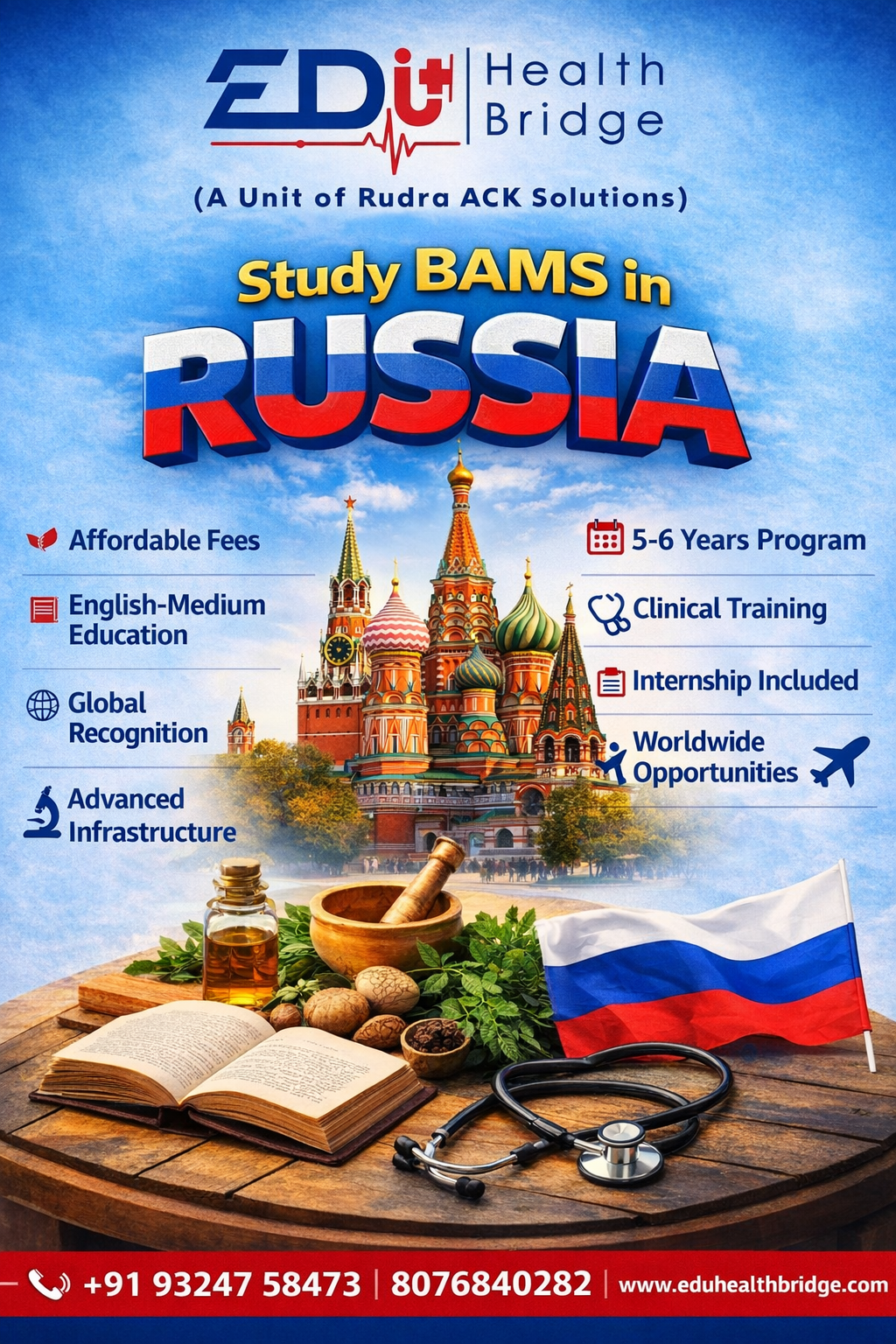 This detailed guide explains everything about BAMS in Russia — eligibility, admission process, fees, recognition, career scope, benefits, and how EduHealth Bridge supports students at every stage.
