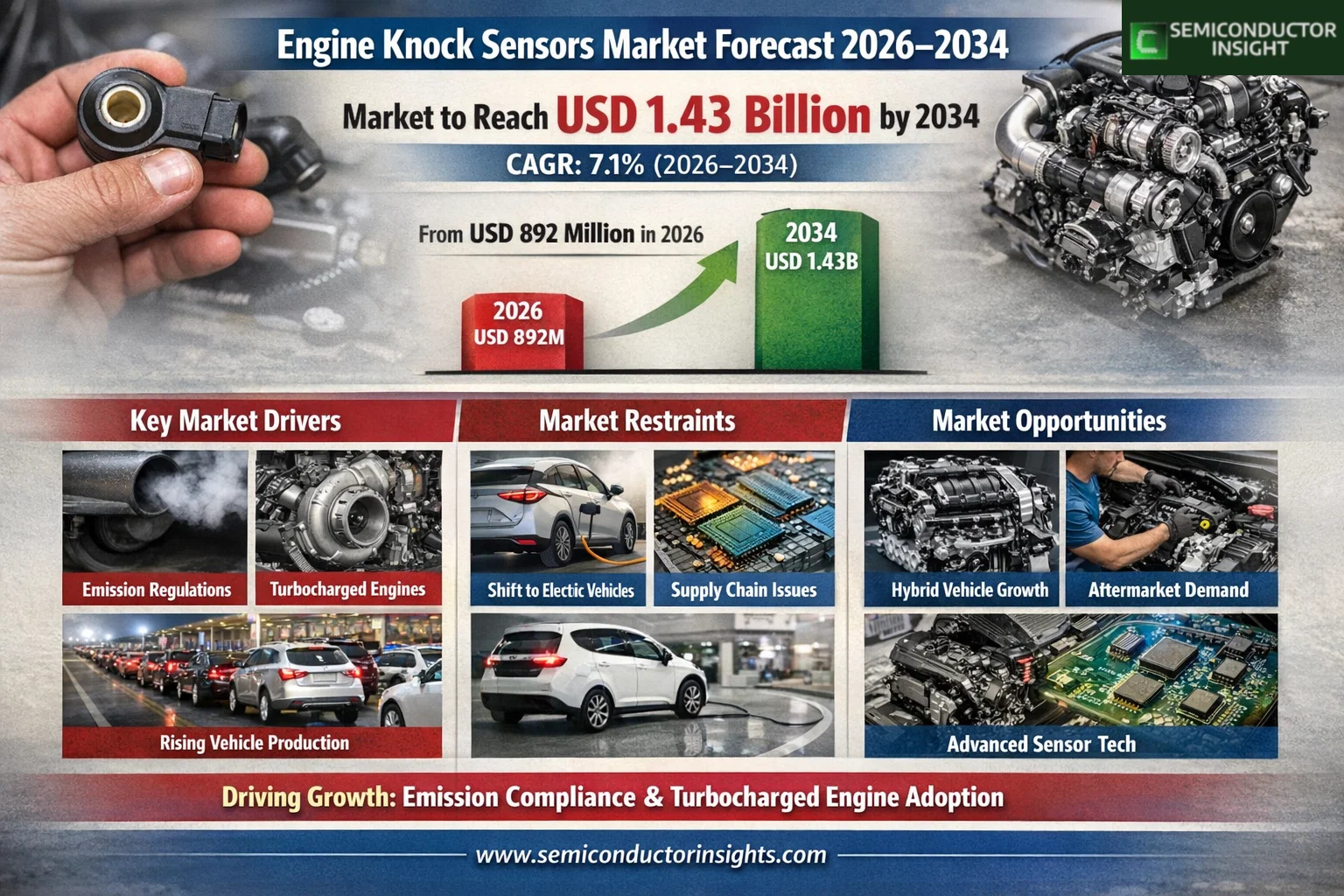 Global Engine Knock Sensors Market was valued at USD 892 million in 2026 and is projected to reach USD 1.43 billion by 2034, expanding at a CAGR of 7.1% during the forecast period 2026–2034. Market growth reflects steady expansion in engine management electronics and tighter combustion control requirements across global vehicle platforms.