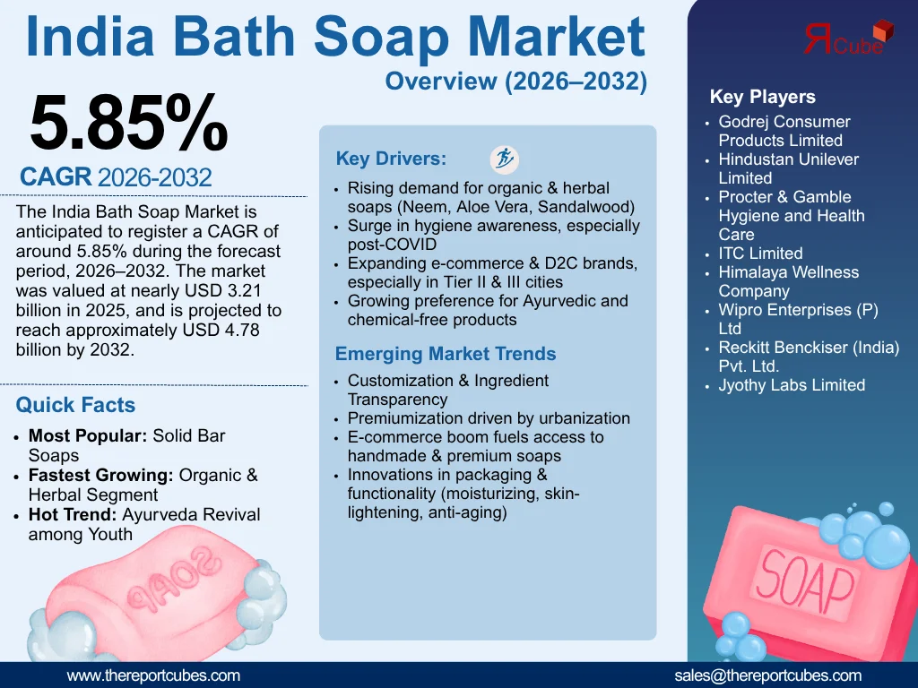 According to The Report Cube’s latest research study India Bath Soap Market is anticipated to register a CAGR of around 5.85% during the forecast period, 2026–2032. The market was valued at nearly USD 3.21 billion in 2025, and is projected to reach approximately USD 4.78 billion by 2032.
