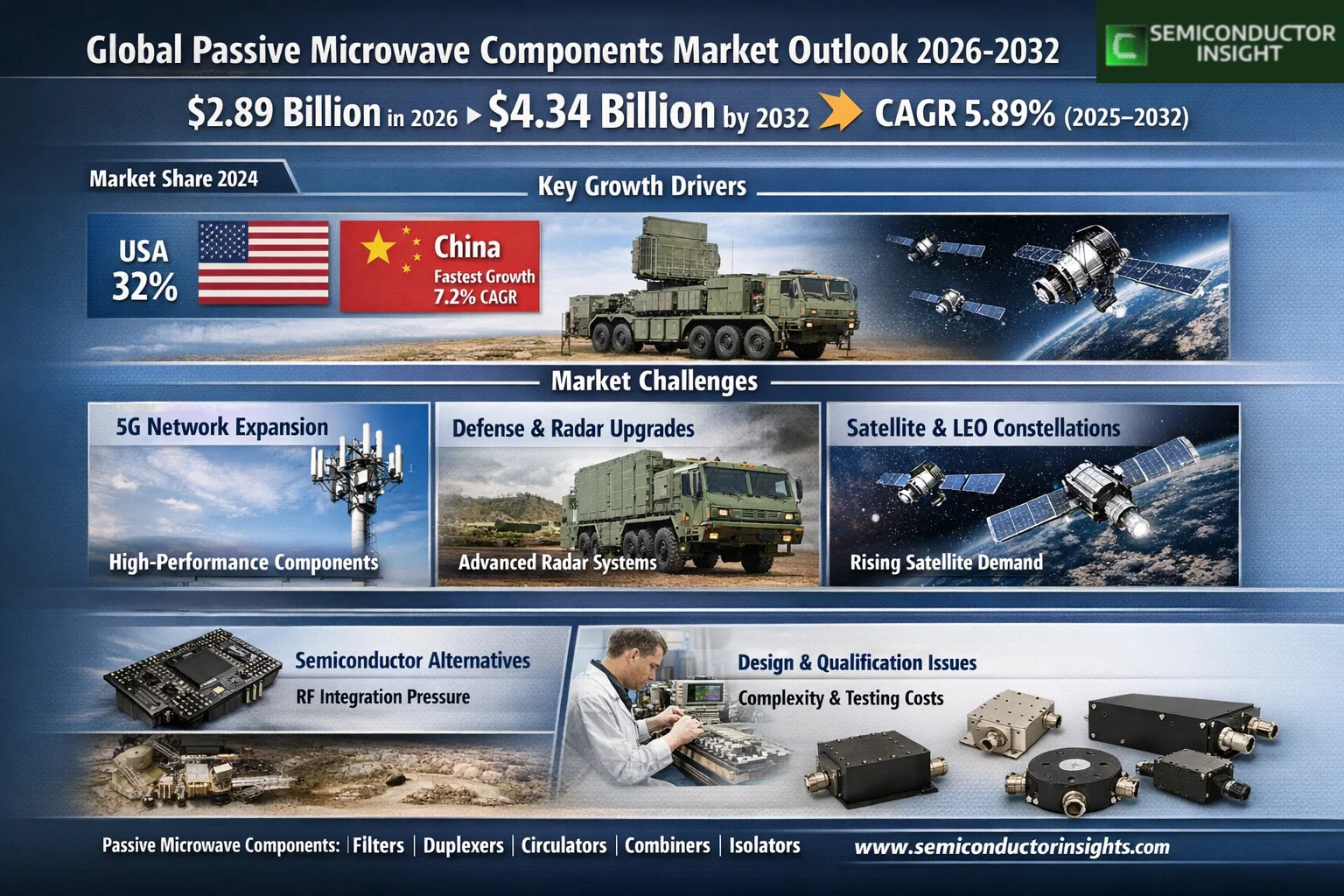Global Passive Microwave Components market was valued at USD 2.89 billion in 2026 and is projected to reach USD 4.34 billion by 2032, growing at a CAGR of 5.89% during the forecast period 2025–2032. Growth momentum is being supported by rapid 5G deployment, rising satellite communication demand, and continued investments in defense radar and electronic warfare systems. The United States accounted for approximately 32% of global market share in 2024, while China is forecast to record the fastest growth rate at a 7.2% CAGR through 2032.