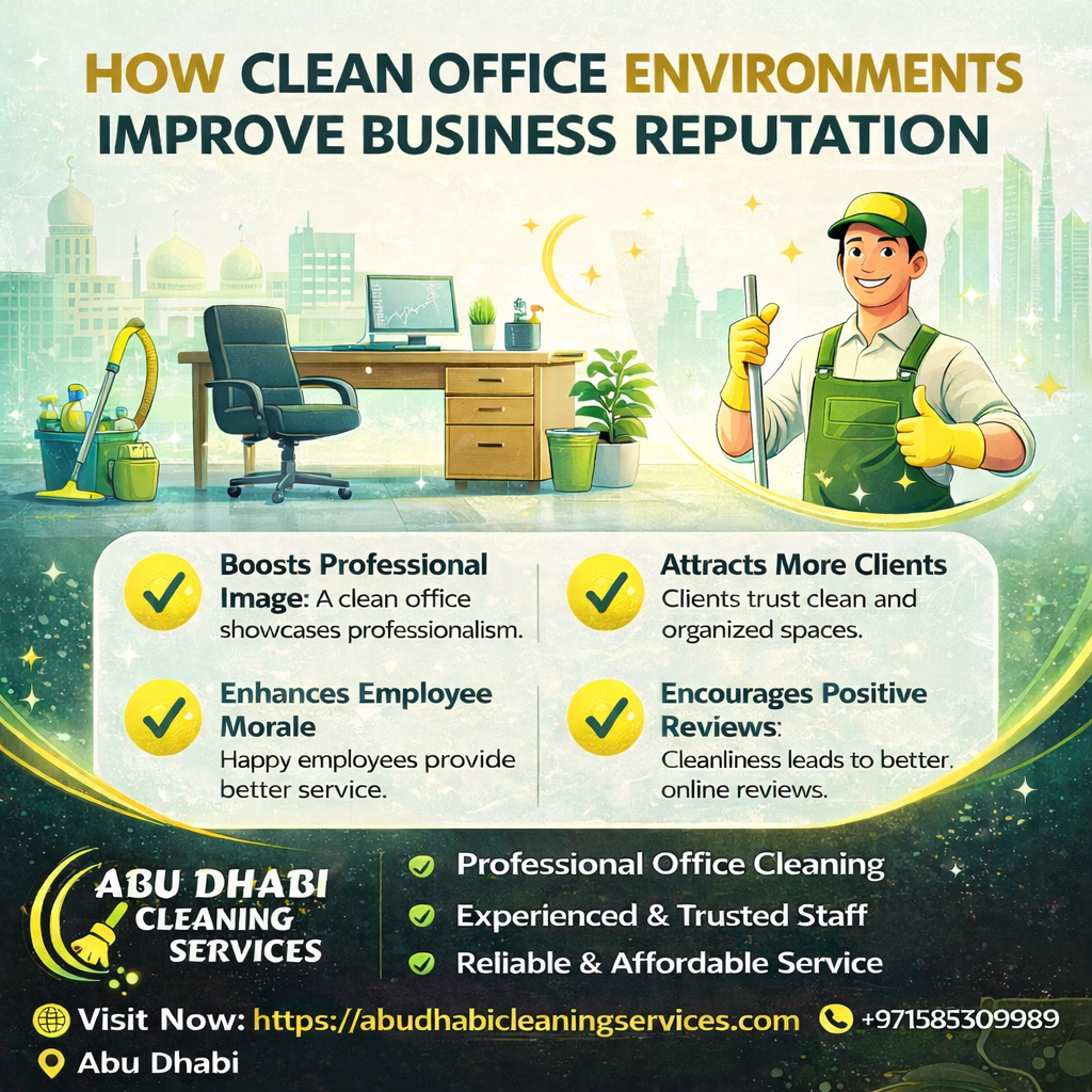 Clean offices reflect professionalism and trust. Cleaning Services Abu Dhabi help maintain clean and presentable workplaces.