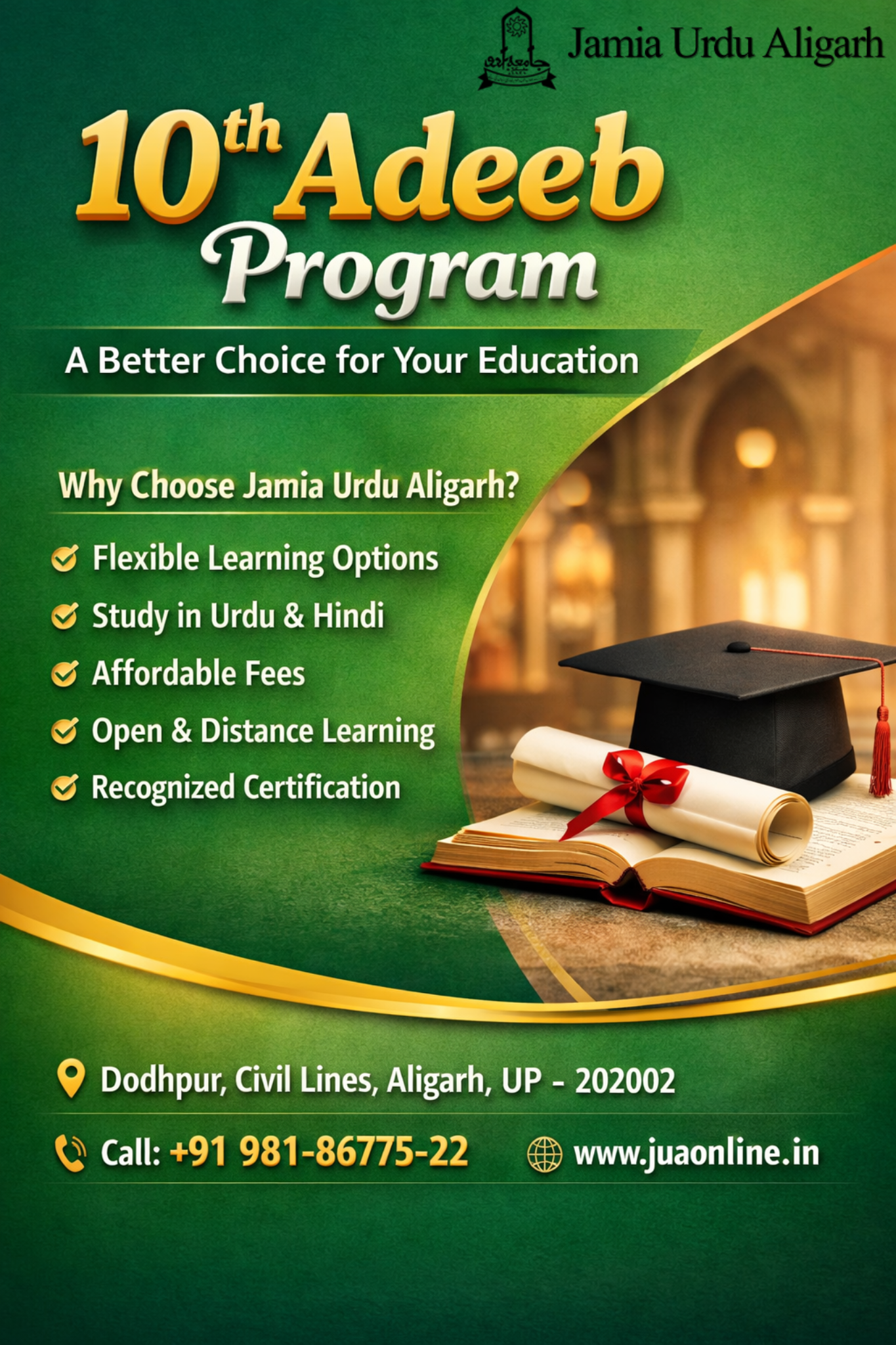 The 10th Adeeb Program is a secondary-level certification course recognized under the umbrella of Jamia Urdu Aligarh, a historical institution established in 1939 to promote Urdu language and education in India. It is equivalent to a 10th-grade education and caters to students who want an alternative to the conventional school system.