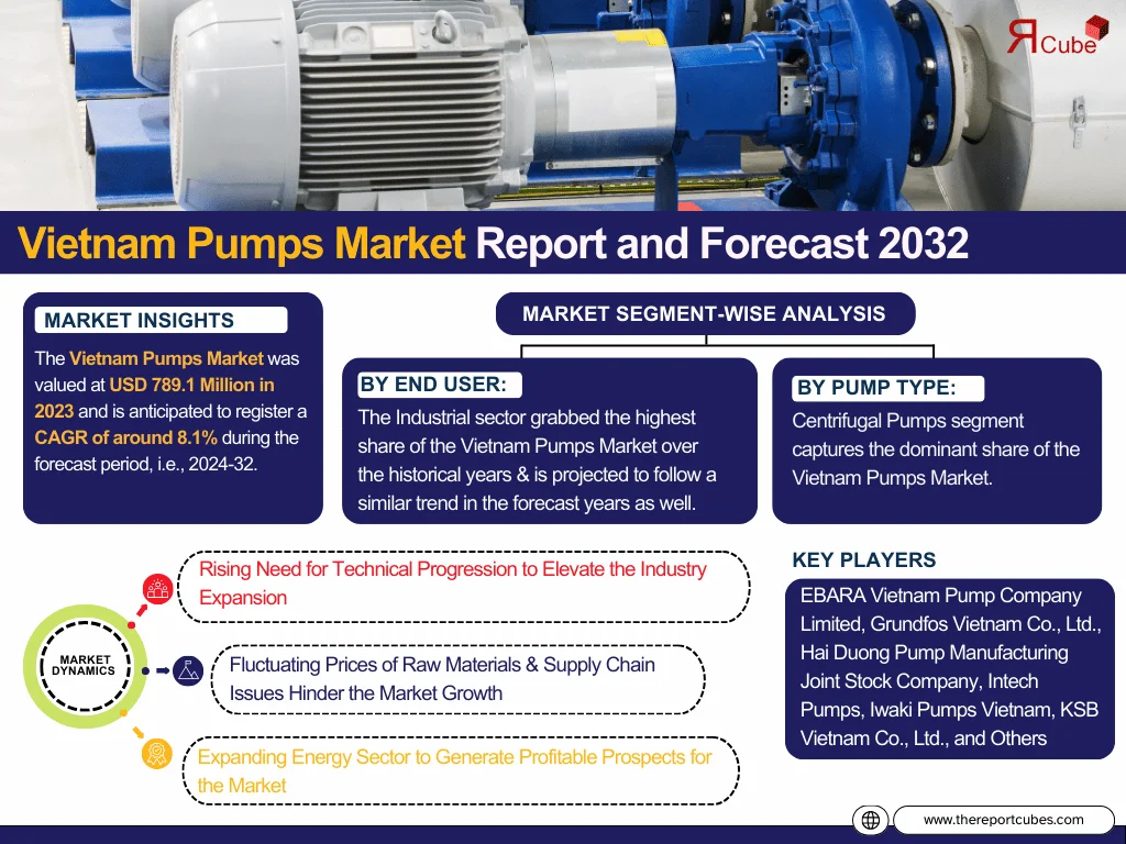 According to The Report Cube’s latest research study Vietnam Pumps Market was valued at USD 789.1 Million in 2023 and is anticipated to register a CAGR of around 8.1% during the forecast period, i.e., 2024-32.