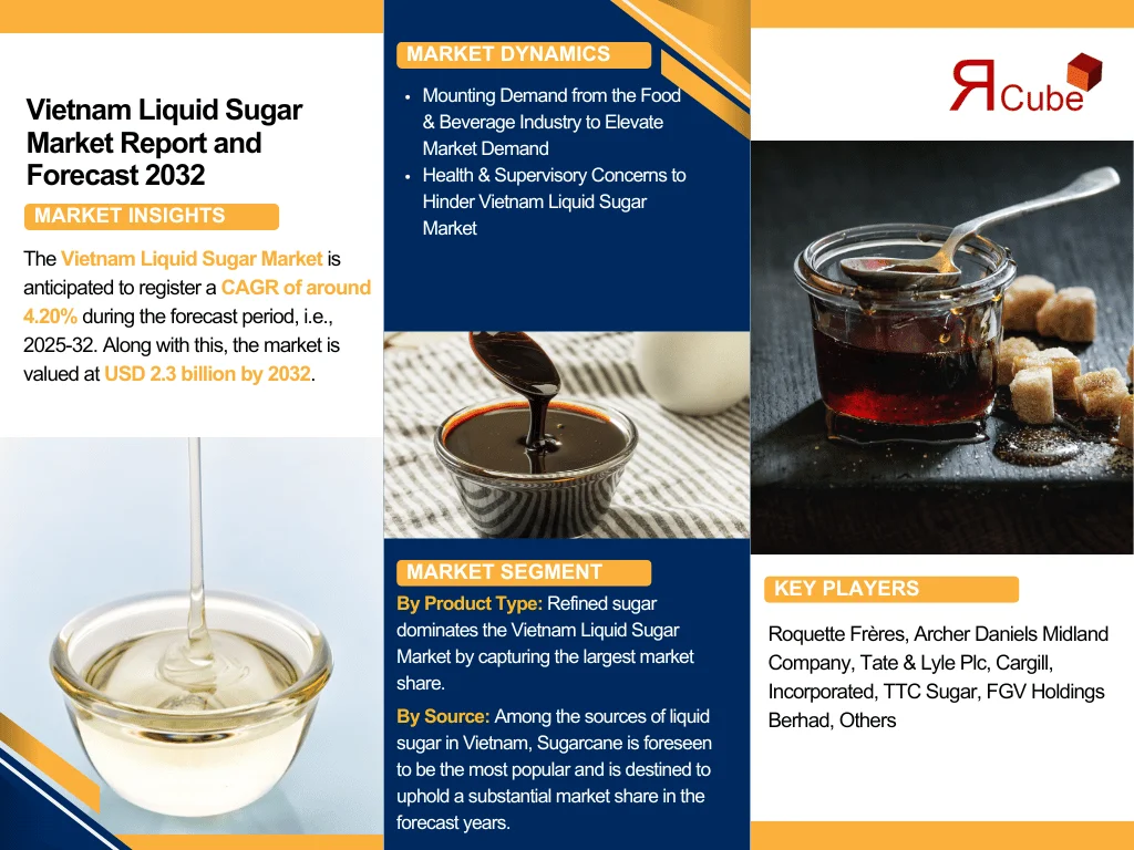 According to The Report Cube’s latest research study Vietnam Liquid Sugar Market is anticipated to register a CAGR of around 4.20% during the forecast period, i.e., 2025-32. Along with this, the market is valued at USD 2.3 billion by 2032.