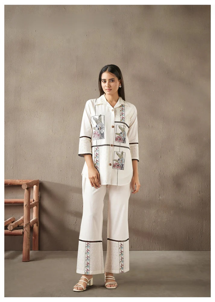 A schiffli co ord set gives the guesswork to styling. A well-balanced, stylish, and classic look, with coordinated tops and bottoms, is something that is ready-to-wear.