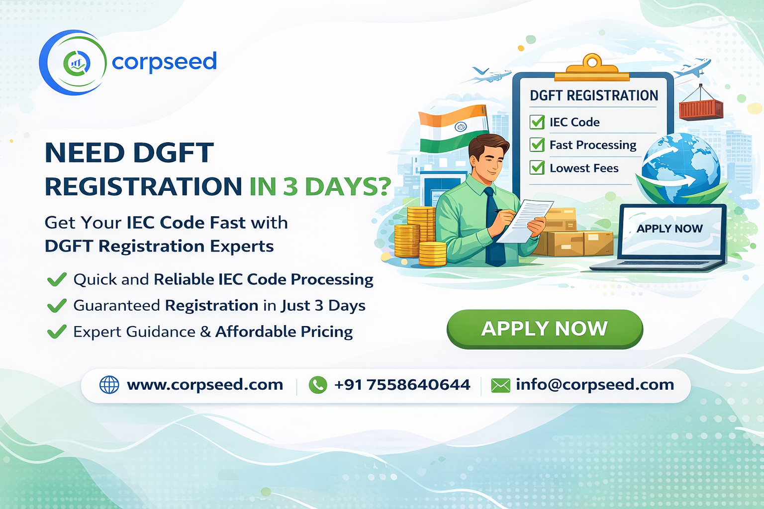 Call Corpseed today at +91 7558640644 and get your DGFT Registration done the smart way!